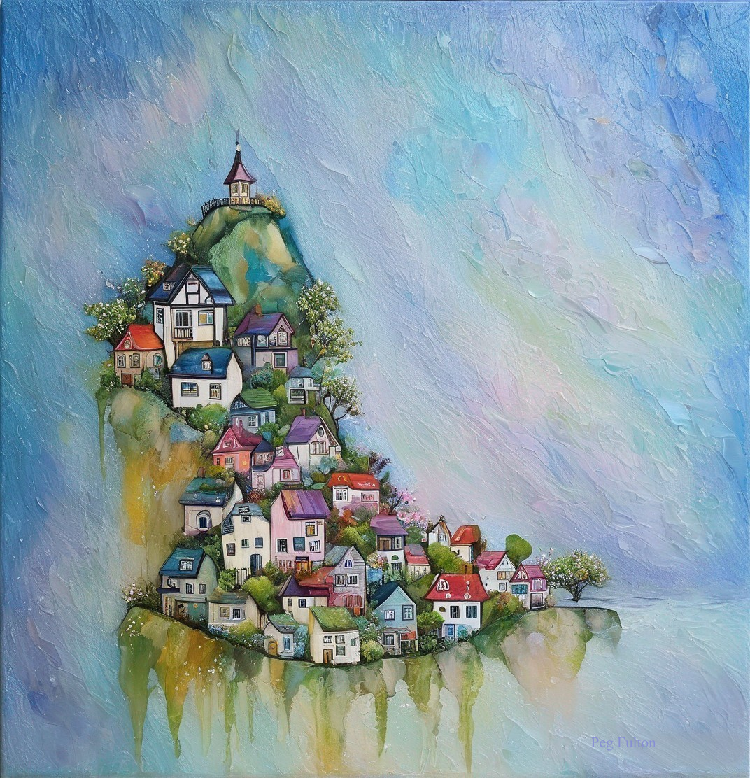 A whimsical painting of colorful houses on a floating island with a blue sky backdrop and a lighthouse on top.
