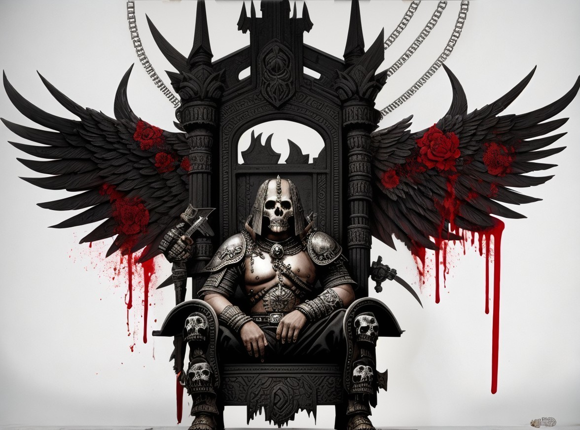 A dark gothic sculpture featuring a large central skull, smaller skulls, red roses, dripping red details, and expansive black wings.