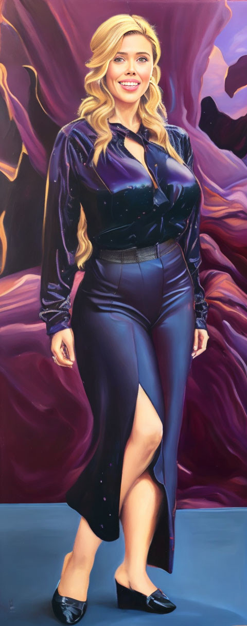 A beautiful hyper realistic oil painting of a (busty maiden with a beautiful-face, big hips, enormous bust, flirty expression, brown-hair)(Scarlett Johanson) wearing a (tight-short-purple-outfit with a plunging neckline) in front of (Alien landscape)