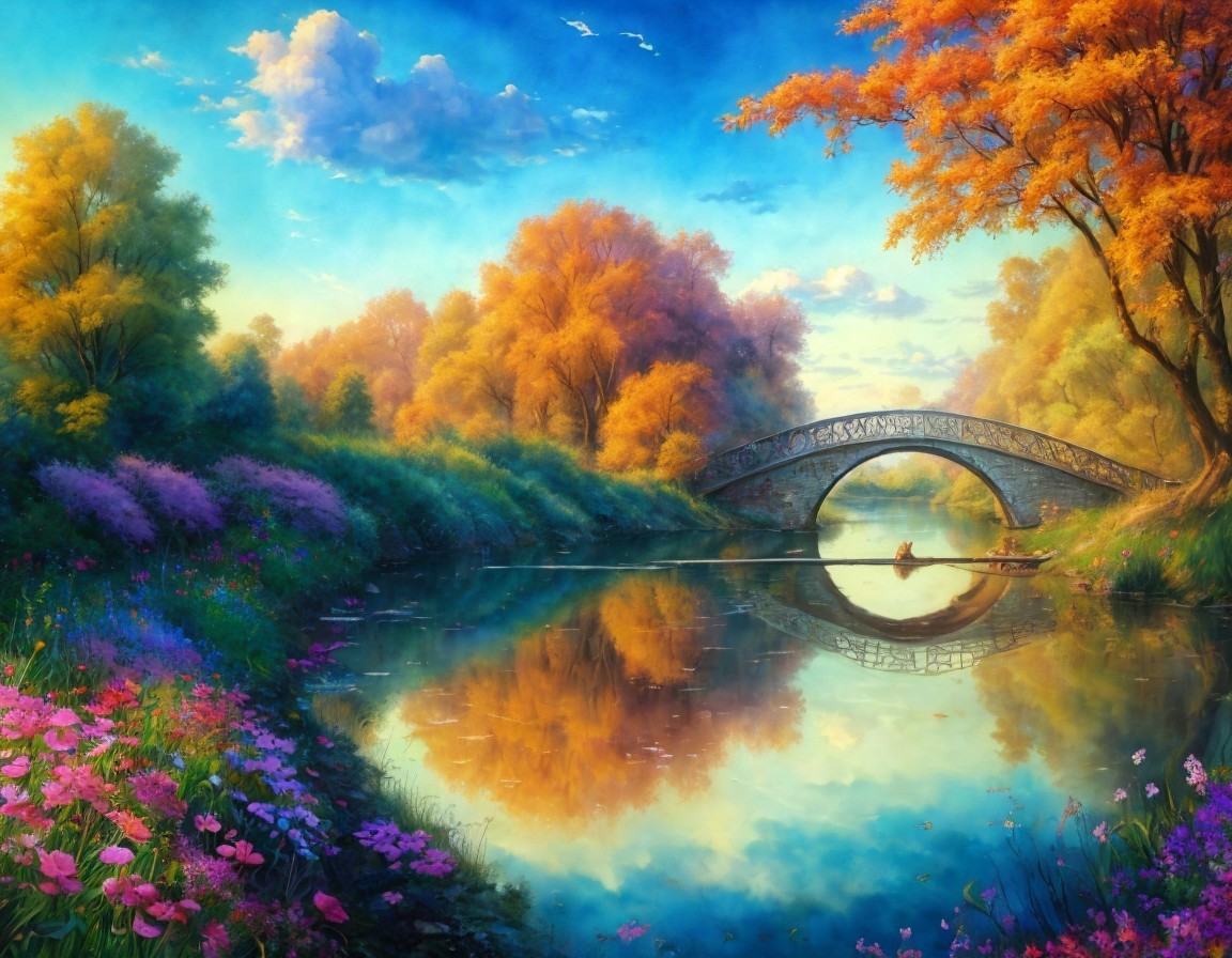 Prompt: Watercolor in the style of Josephine Wall, Tomasz Allen Kopera, Dariusz Zawadzki, Andreja Peklar, Ivan Shiskine, beautiful complex landscape, a wide river flowing from back to front, an elegant, graceful bridge over the river with a path leading on the right side leads through fields of tall grass, wildflowers and beautiful old oak trees. On the left side of the river the path leads to an old stone house with a wooden porch, with a low stone fence in front and a garden full of flowers, trees on both sides of the house, some Birds can be seen in the air, and herons by the river, with mountains in the background