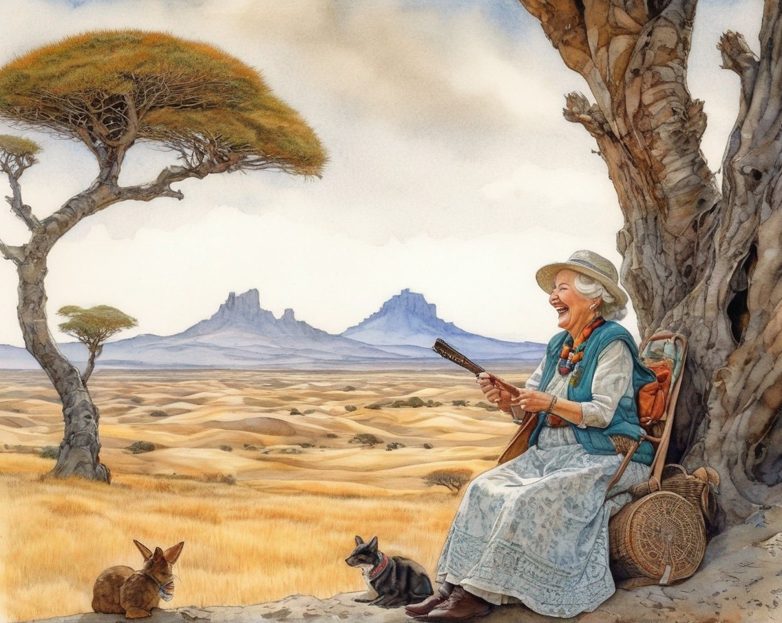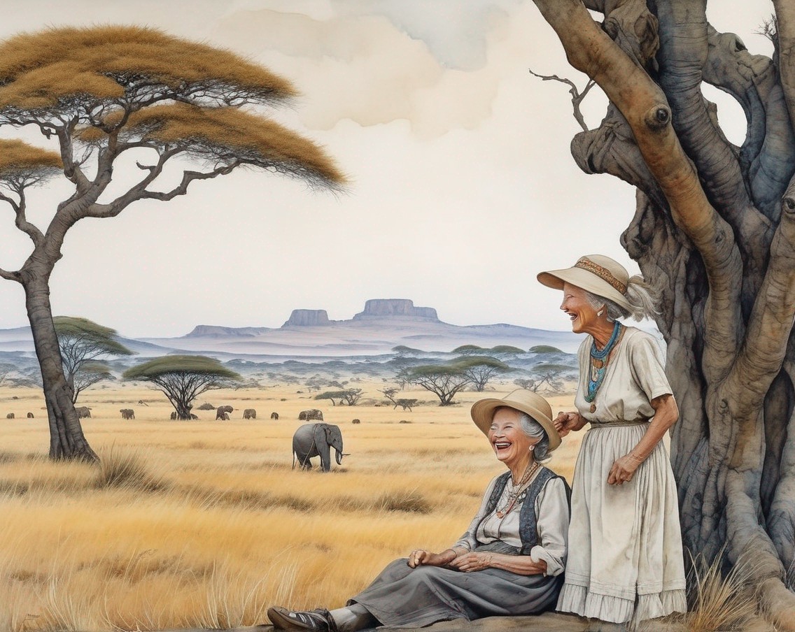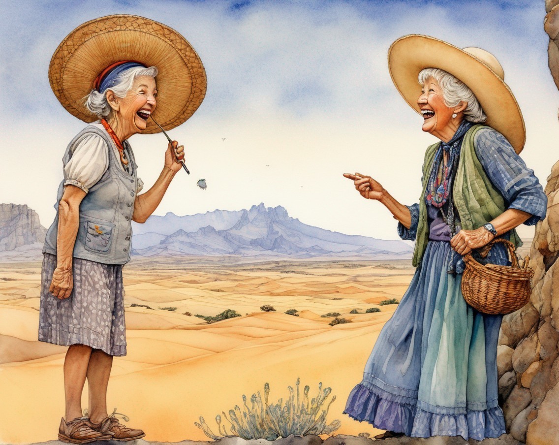 Two elderly women are laughing joyfully in a desert landscape, one holding a basket and the other with a spoon and cup.