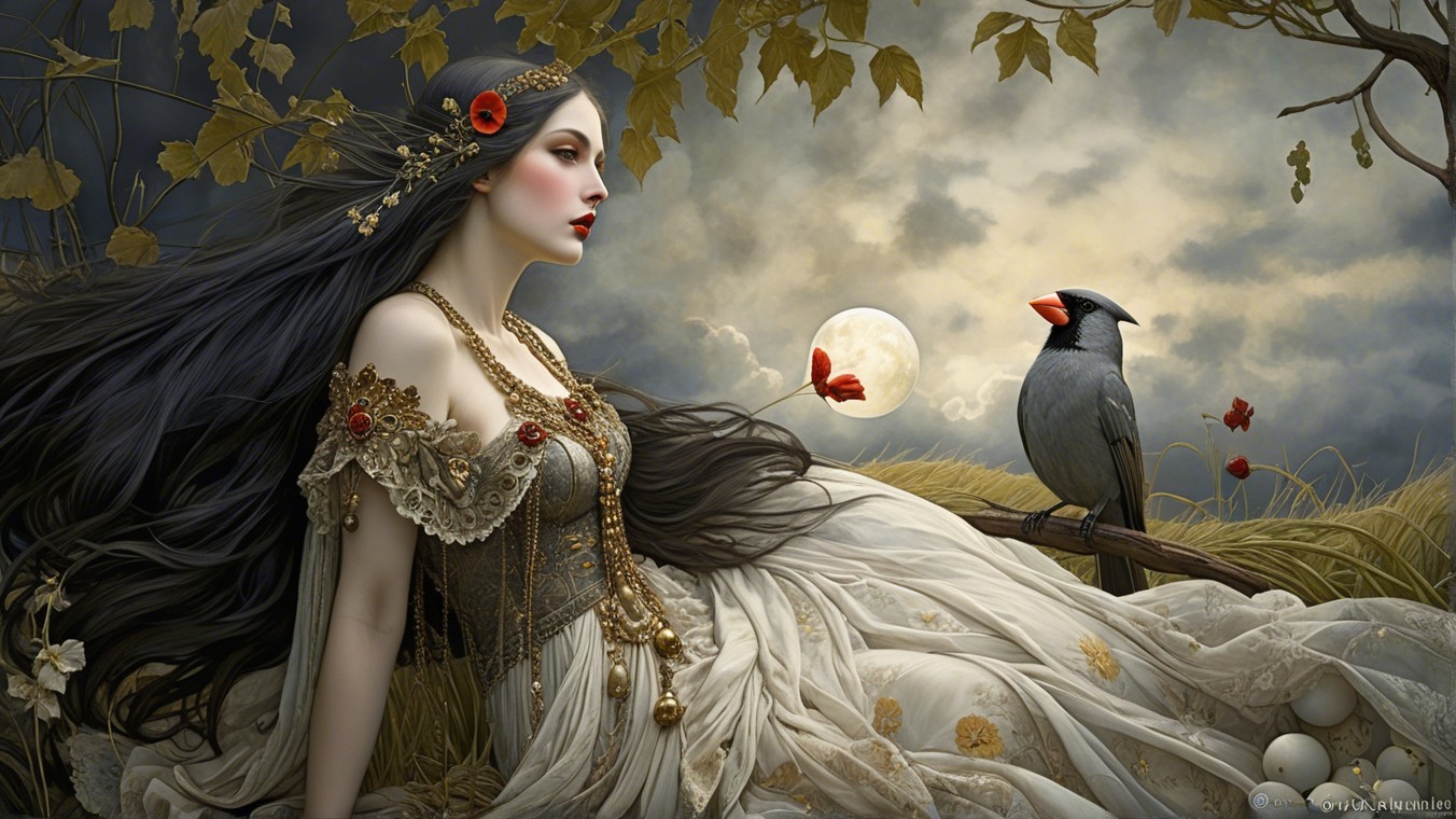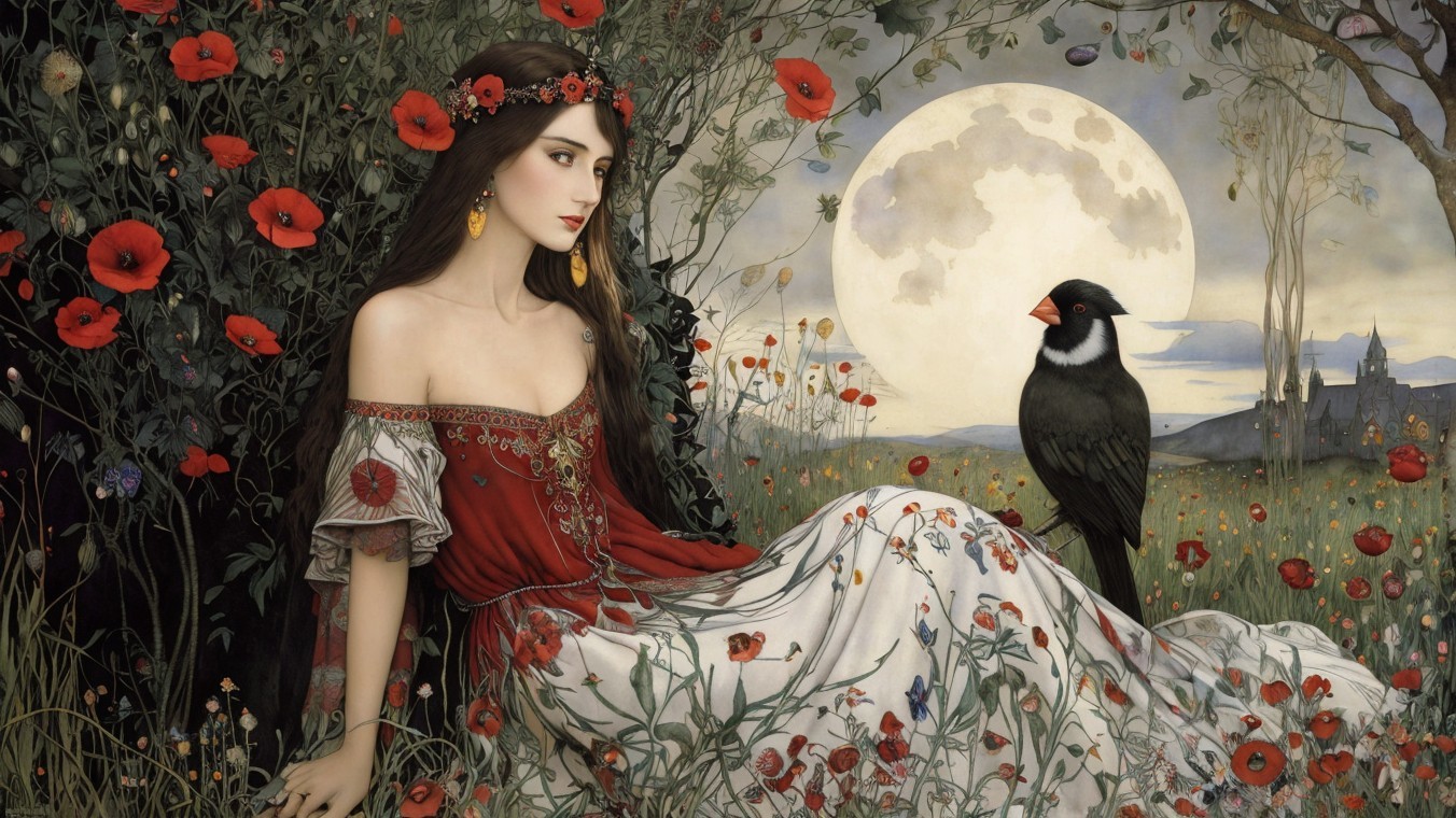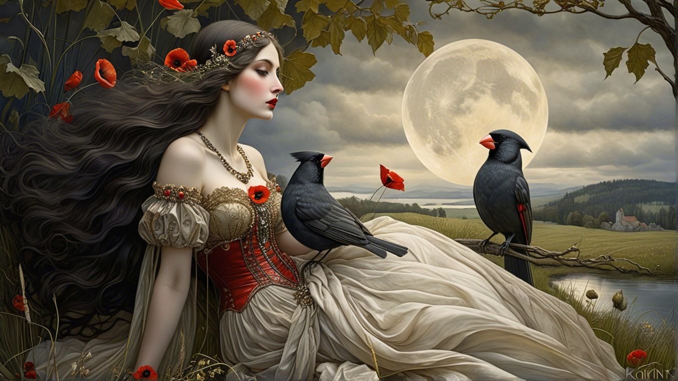 A serene woman adorned with flowers sits beside a vibrant red cardinal in a lush garden. The full moon glows softly behind her, enhancing the enchanting atmosphere of nature and beauty.