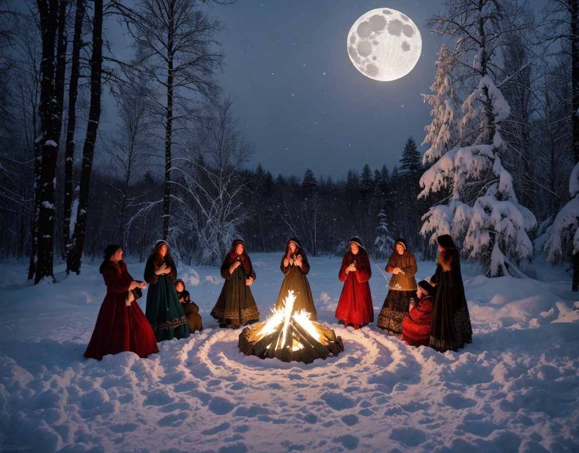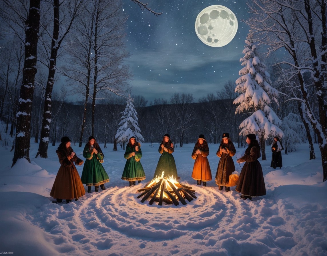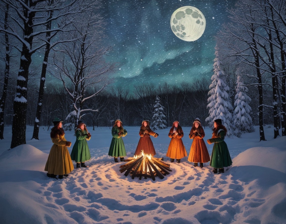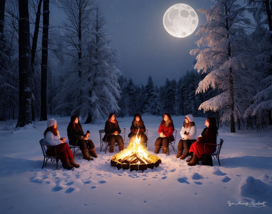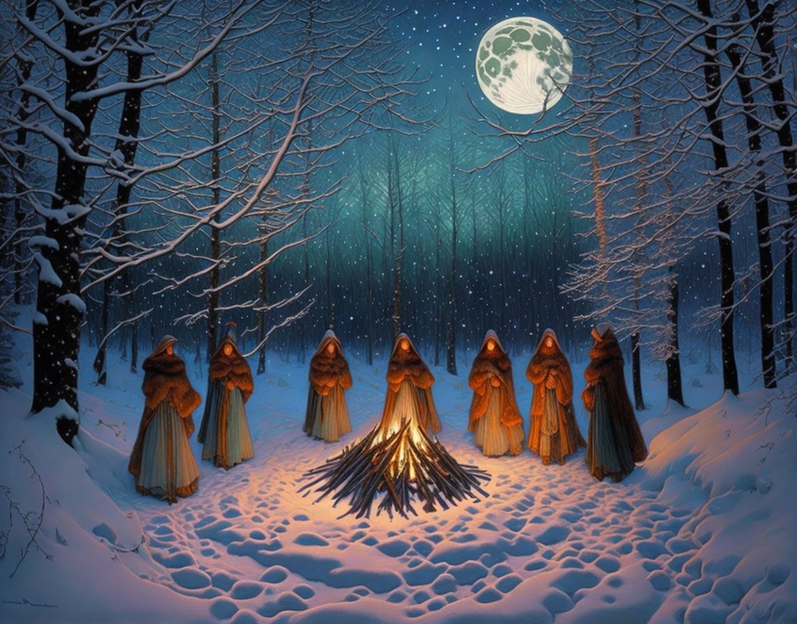 Group around bonfire in snowy forest under full moon with winter solstice blessings.