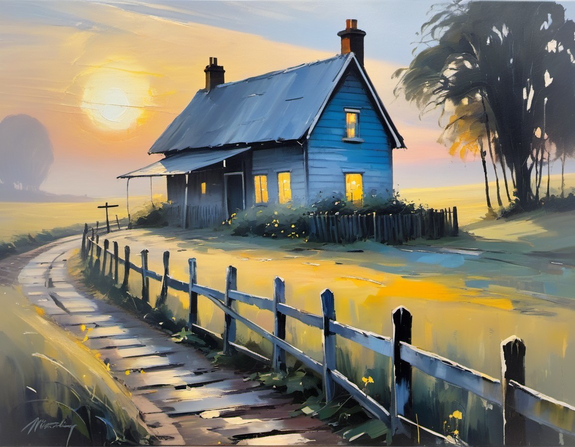 Prompt: Old grubby railway station and neglected cottage, crooked fence, bench. Atmospheric sunrise, dreamy abstract expressionism in a blend of blue, grey and white, streak of yellow, atmospheric sunrise, textured Monet.
