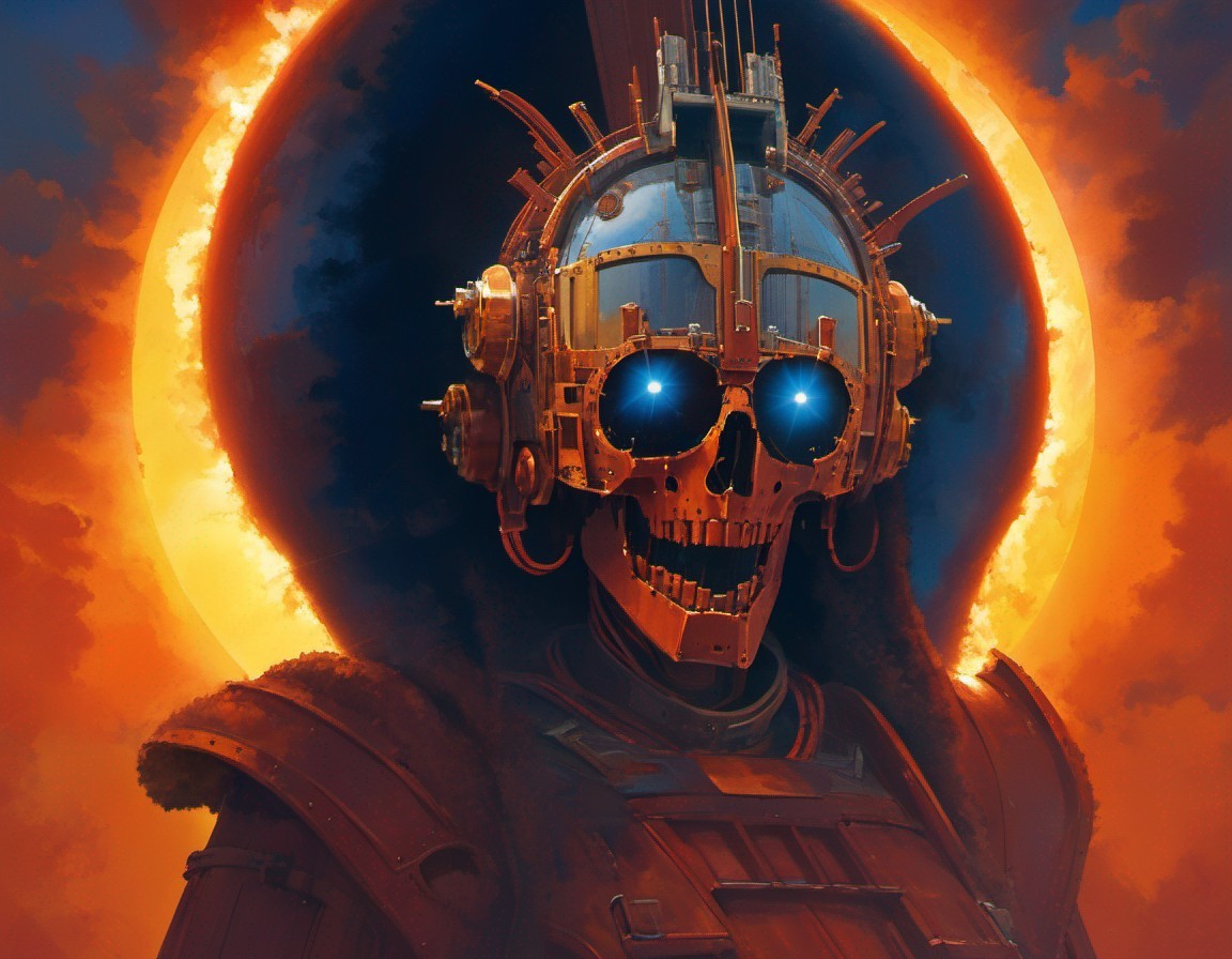 Prompt: dark temple samurai sun machine harbinger of tyranny - the towering structure of the Golden Gate Bridge from a low-angle view, showcasing the grandeur of its orange-red steel against a bright blue sky with sparse, fluffy clouds. The focus is on the south tower, viewed from the base looking upwards. The reddish-orange paint of the bridge has a slightly weathered texture, reflecting sunlight. The details include art deco elements, vertical and horizontal lines, and rivets along the steel surface. Cables stretch upward from the tower, converging seamlessly into the sky. Two thick vertical cables cut through the composition, and the suspension cables create an intricate pattern against the sky. The perspective is such that it emphasizes the height and solid construction of the iconic bridge.