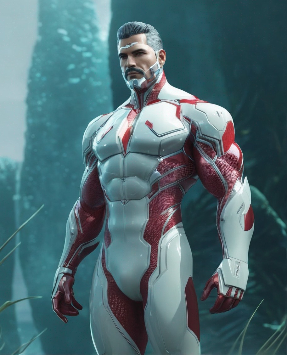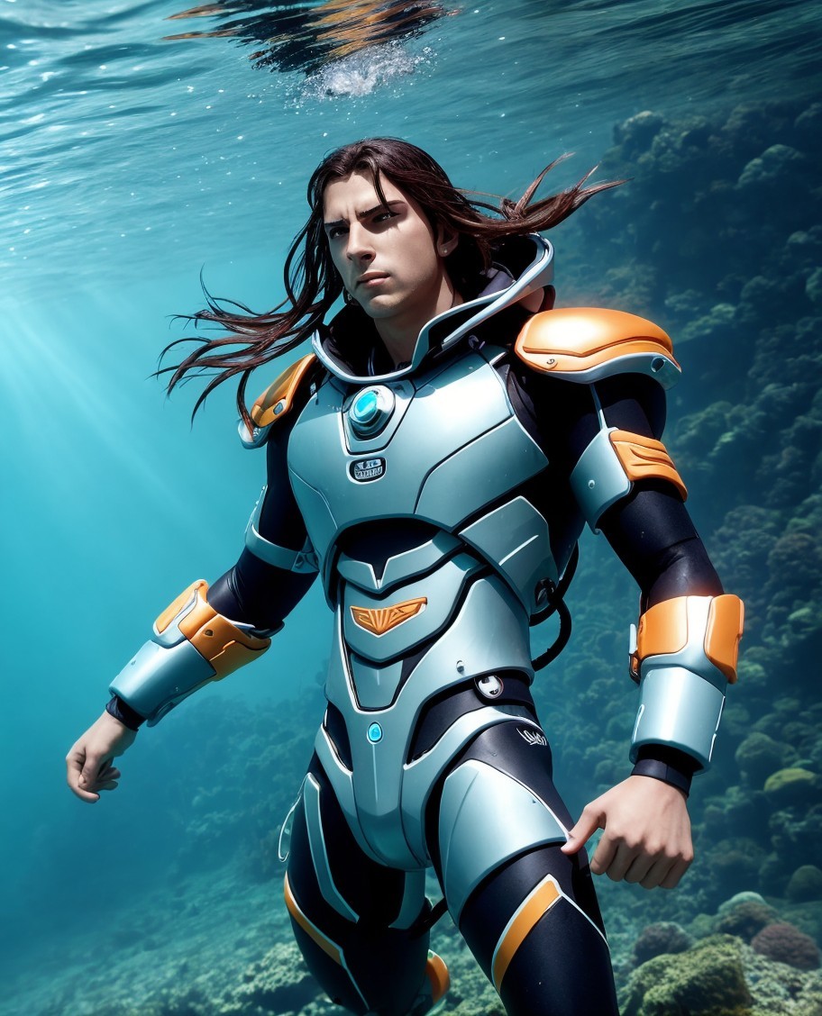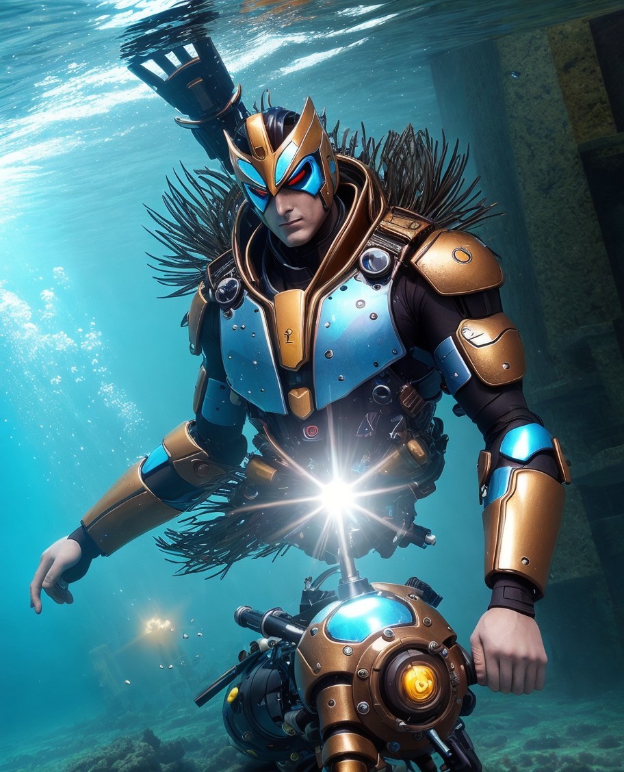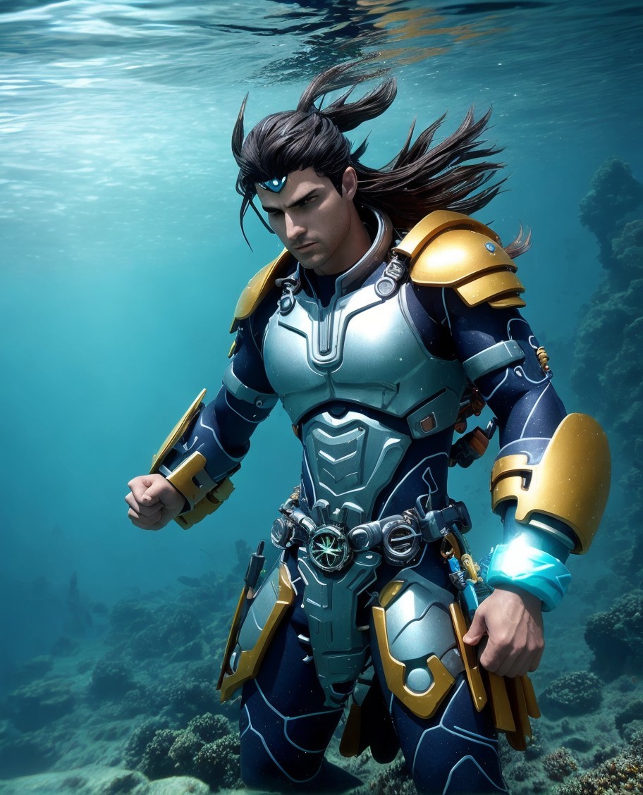 An animated warrior in ornate armor swims underwater, rays of light piercing the water above him.