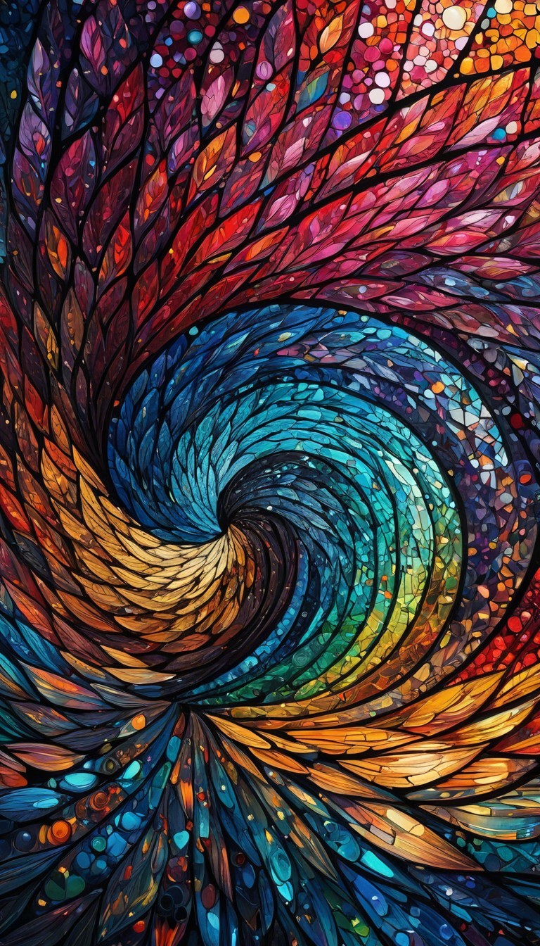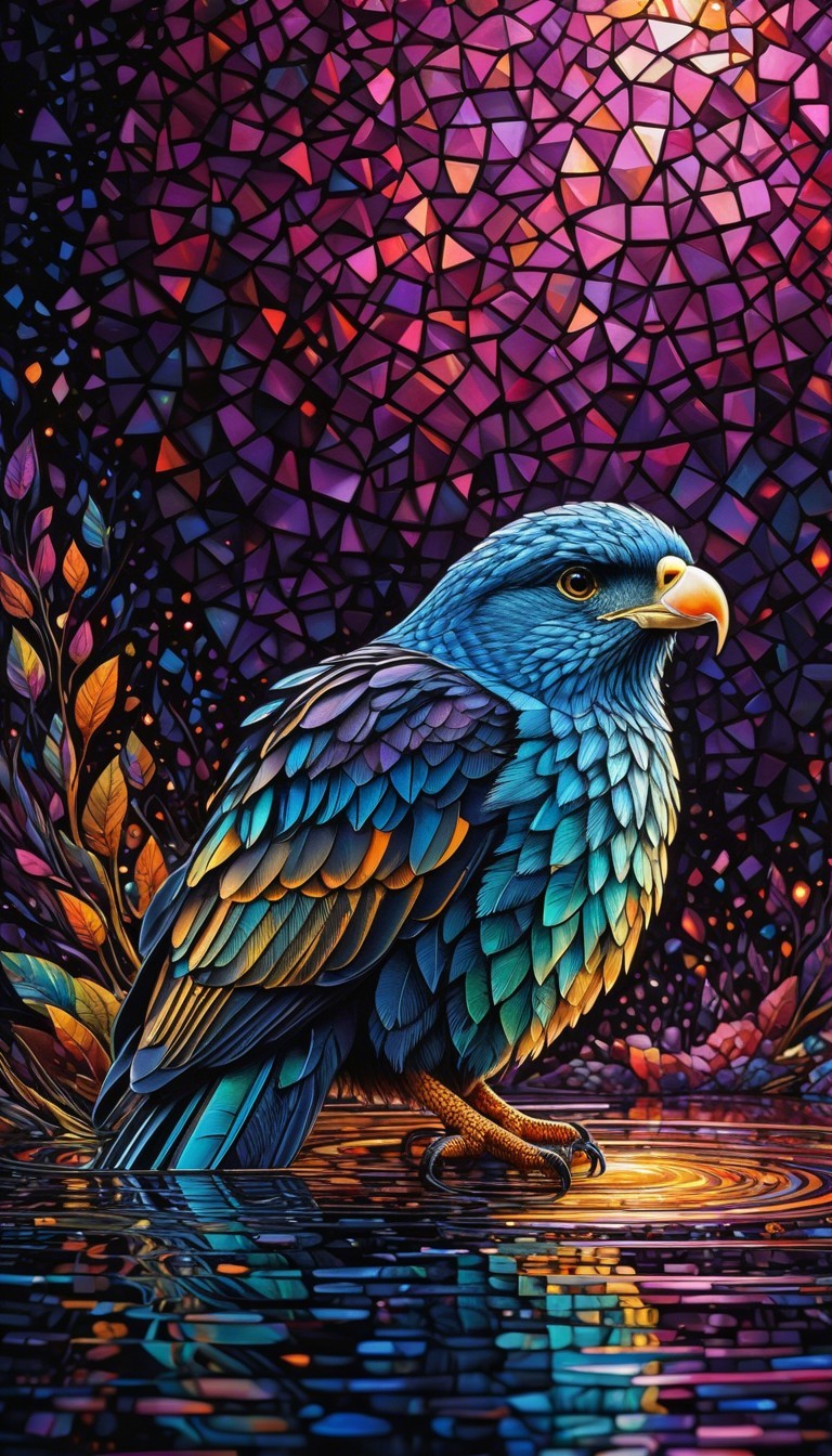 The image features a beautifully detailed eye adorned with elaborate patterns, textures, and colors. Elements like feathers, droplets, and butterflies create a vibrant, surreal effect.