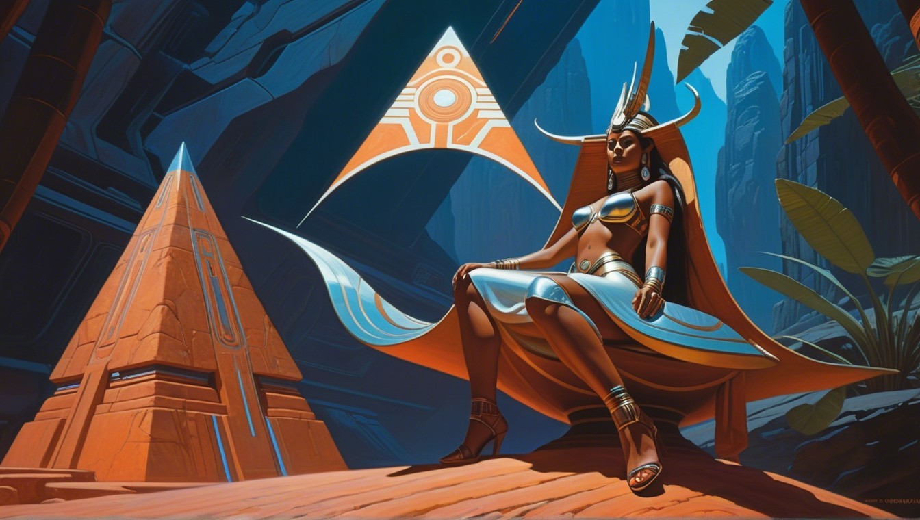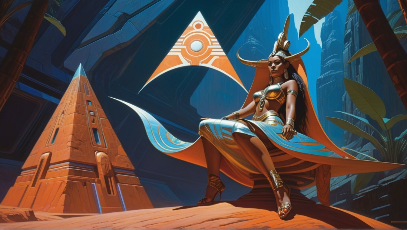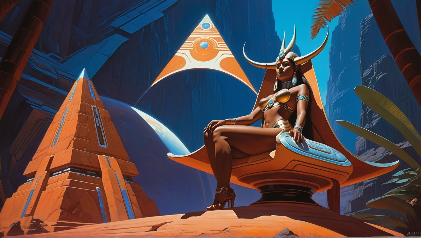 A futuristic scene depicts a regal figure seated on a throne, surrounded by pyramids and a vibrant cosmic background featuring planets and geometric shapes. The atmosphere exudes mystery and power.