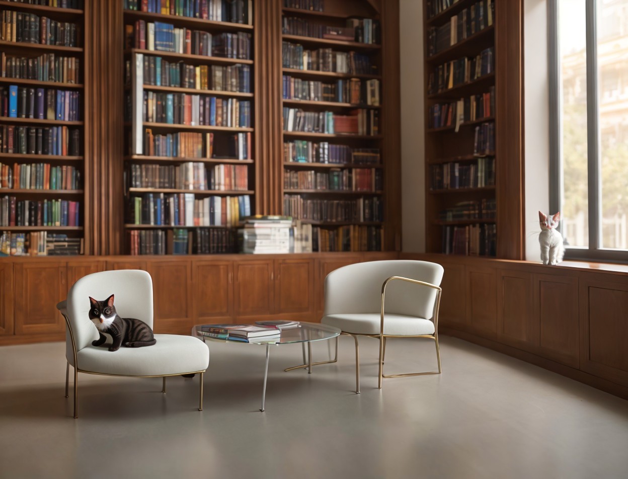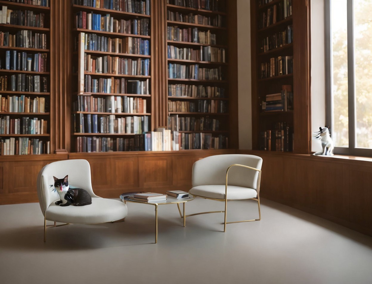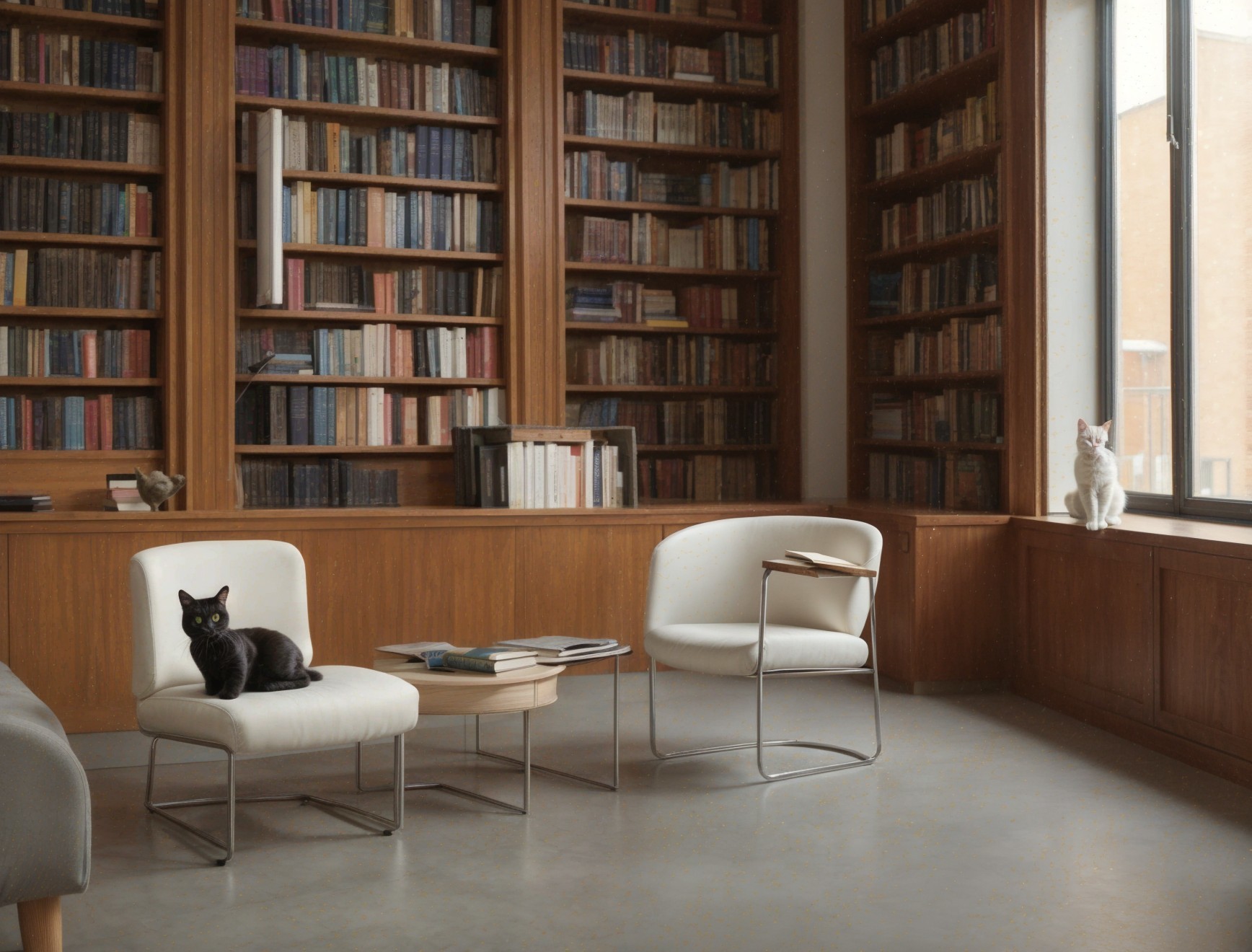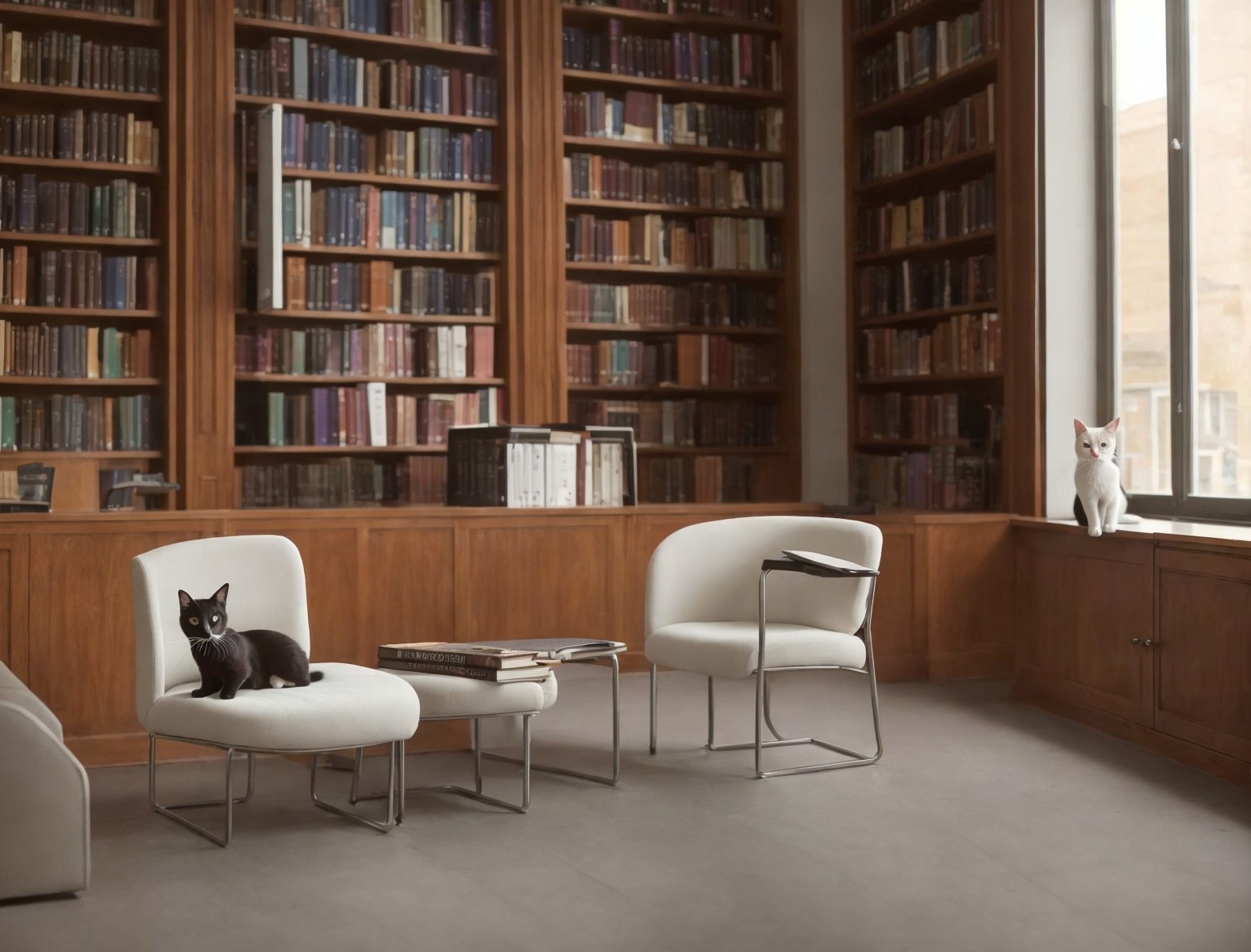 A cozy library scene features two stylish white chairs and a small table. One black cat lounges on a chair while a white cat perches on the windowsill amidst wooden bookshelves.