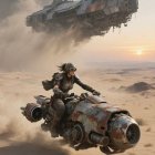 A woman rides a steampunk-inspired motorcycle through a desert landscape, showcasing intricate brass details and a vintage design. She exudes confidence in her stylish, edgy outfit.