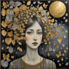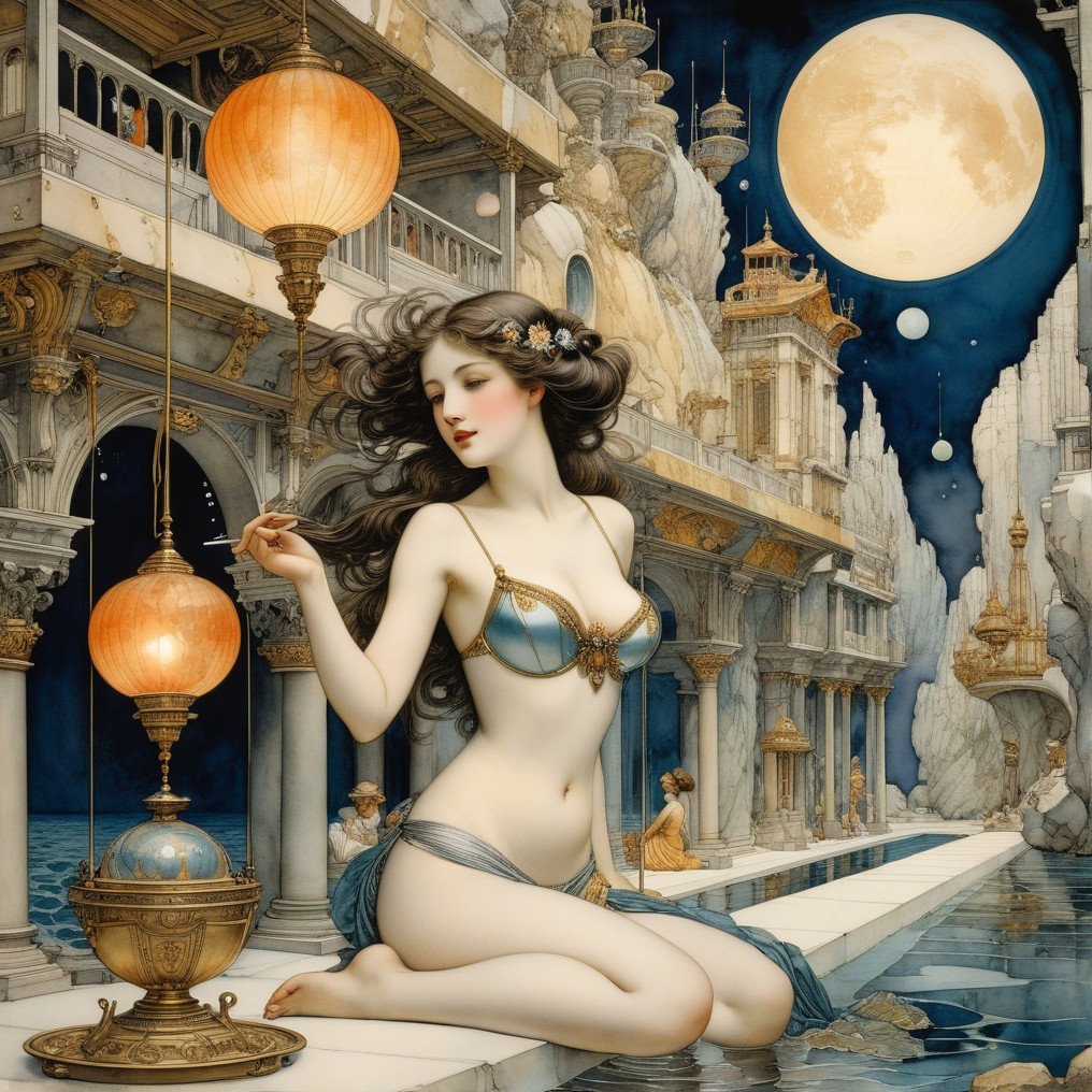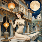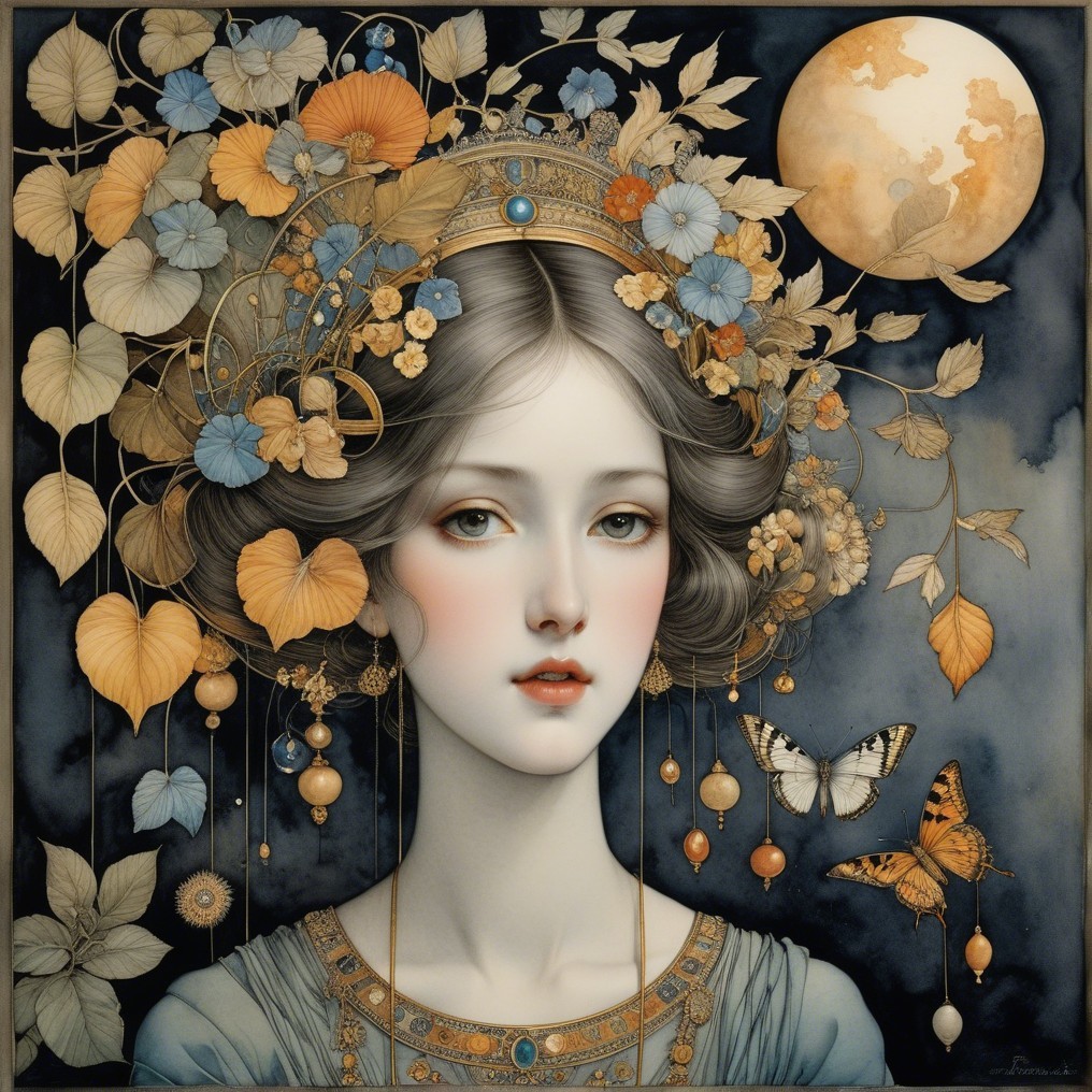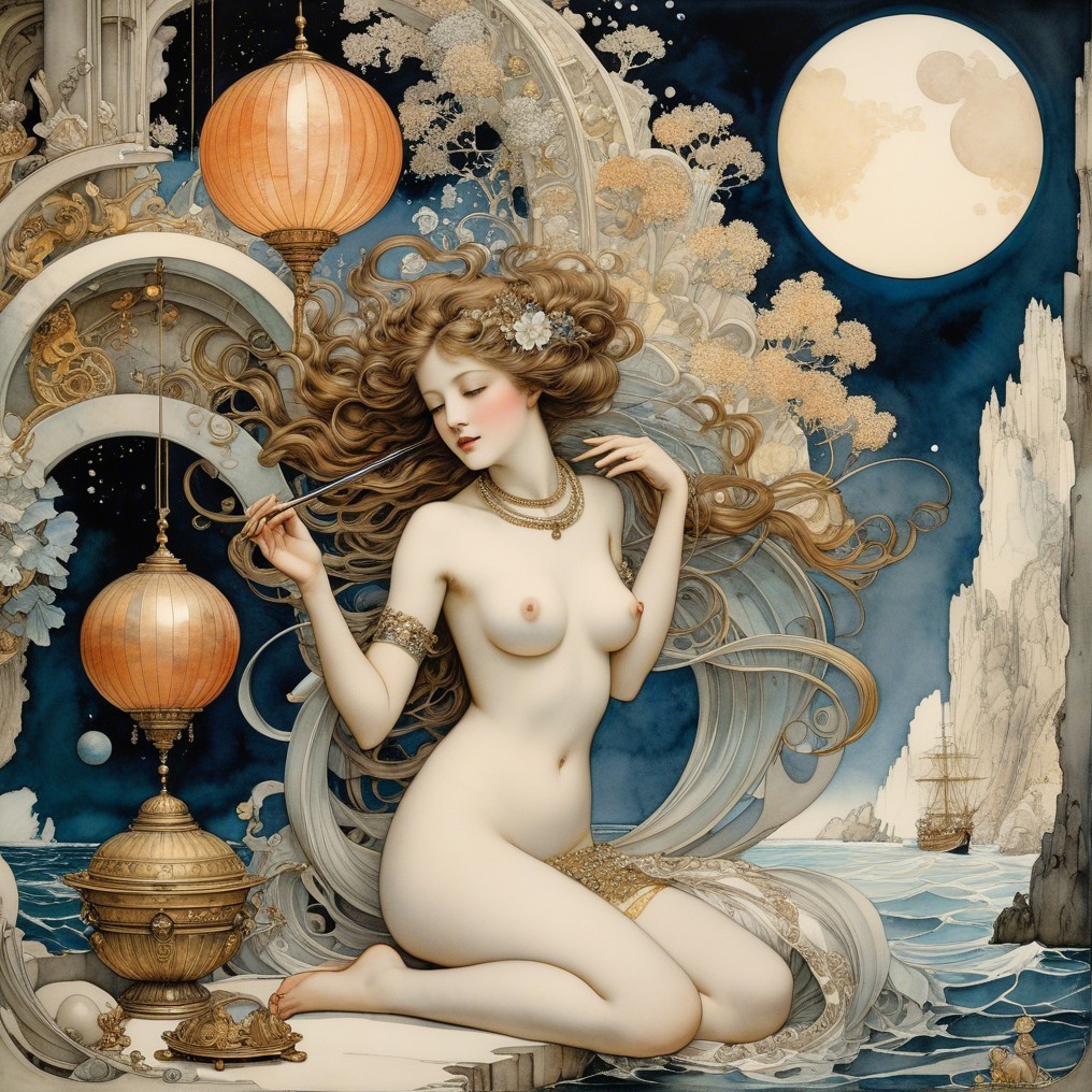 A serene woman, adorned in delicate jewelry, kneels by the shoreline. Surrounded by flowing waves, intricate flora, and a golden fish, she embodies a mystical, dreamlike atmosphere under the moonlight.