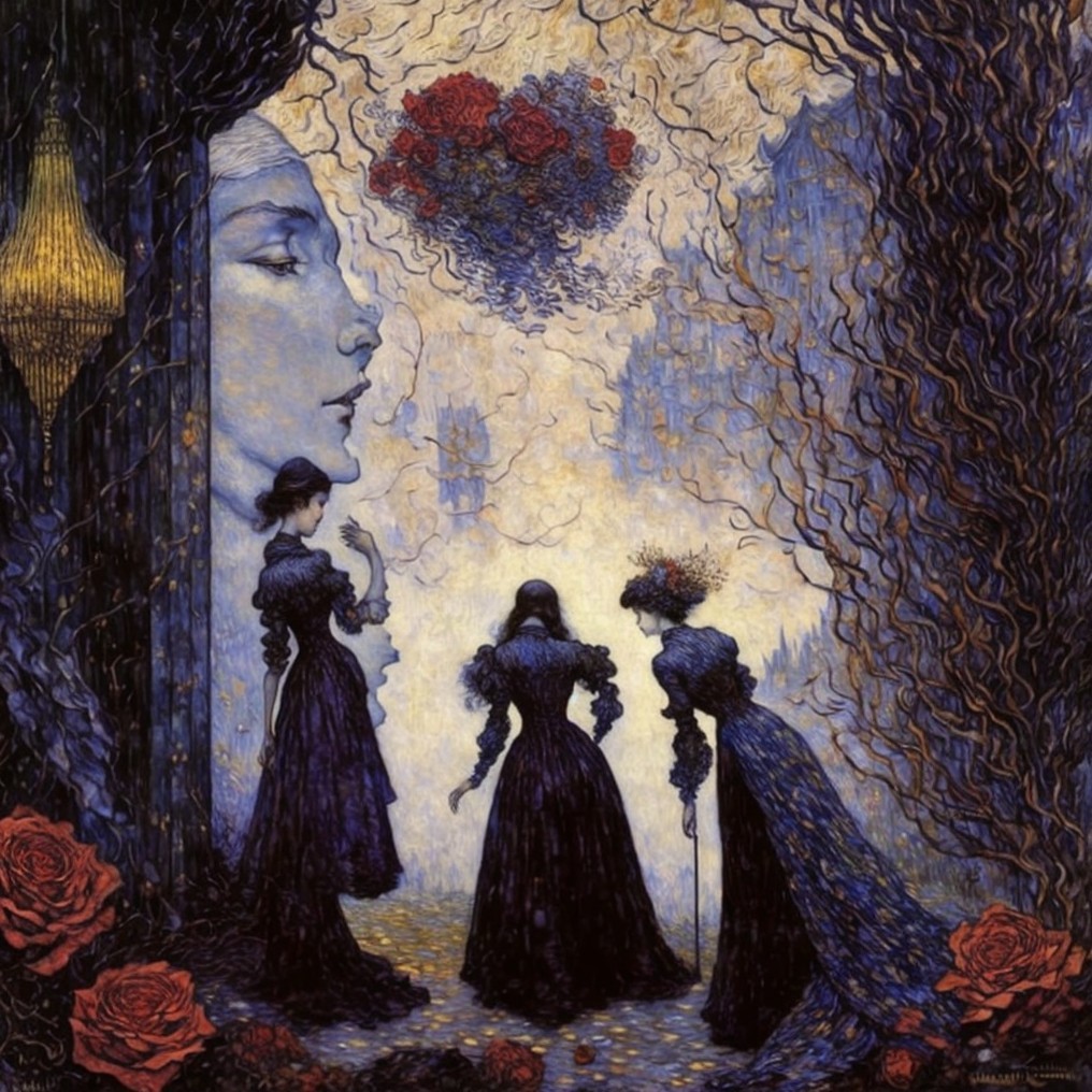 Prompt: Tragic love, dramatic love, by Van Gogh, Arthur Rackham, Paul Klee, pen and ink, dreamy, Steve Hanks, Edward Gorey, disturbing, metallic colors, foreboding, Esao Andrews, biomorphic, hallucinatory, Dorota Pietrowiak.