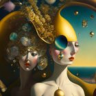The artwork features two elegant, intertwined faces adorned with intricate, golden headpieces. A surreal landscape with celestial bodies and mountains creates a mystical atmosphere, blending fantasy and beauty.