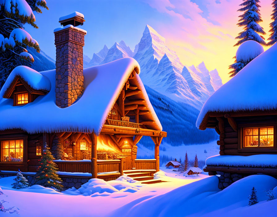 Inside a Swiss chalet, snow capped mountain view out of window, with a fireplace, at night
