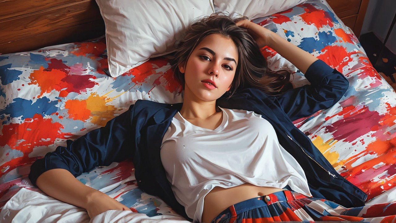 A young woman lounges on a colorful bedspread, wearing a casual outfit. She has long hair and a relaxed expression, creating a cozy and inviting atmosphere. Natural light enhances the scene.