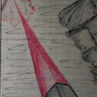 The image depicts a bright red laser beam piercing through a dark, wavy surface, with cliffs on the right side, creating an atmosphere of mystery and intrigue.