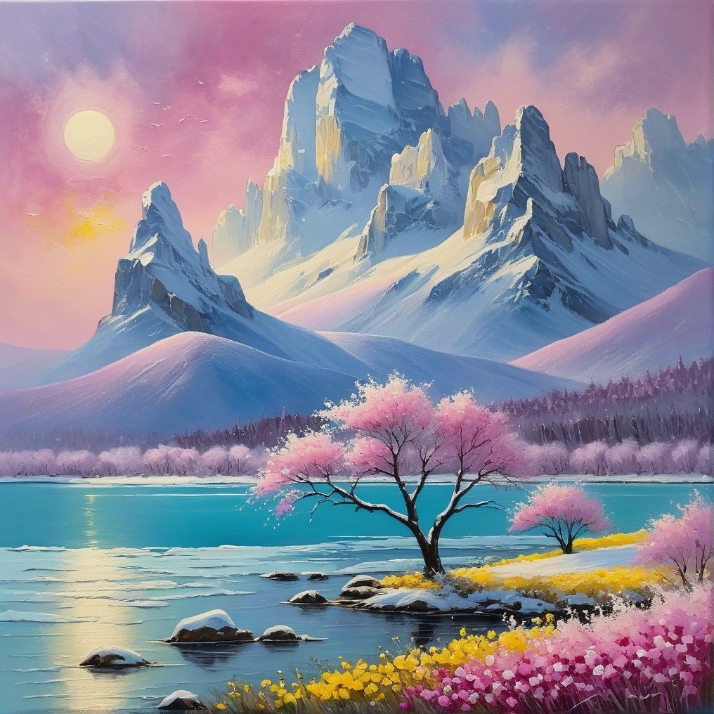 A serene landscape featuring majestic snow-capped mountains, a calm lake reflecting pastel skies, and blooming cherry blossom trees alongside vibrant yellow flowers. Radiant and tranquil.