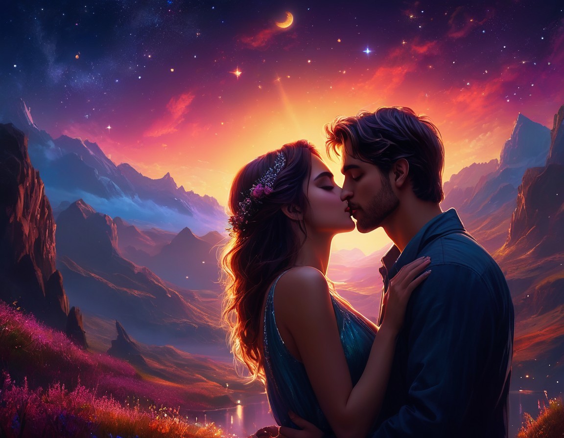 Couple Kissing in Vibrant Fantasy Landscape