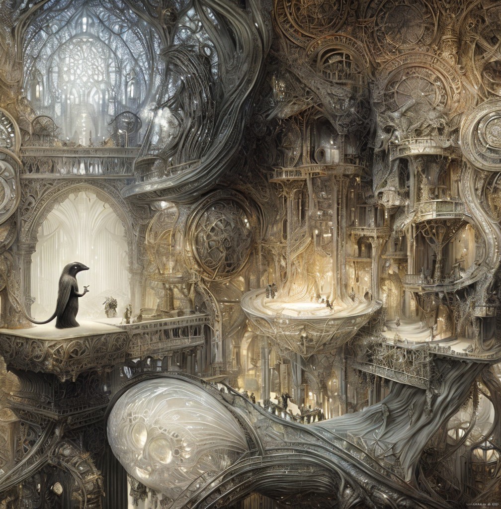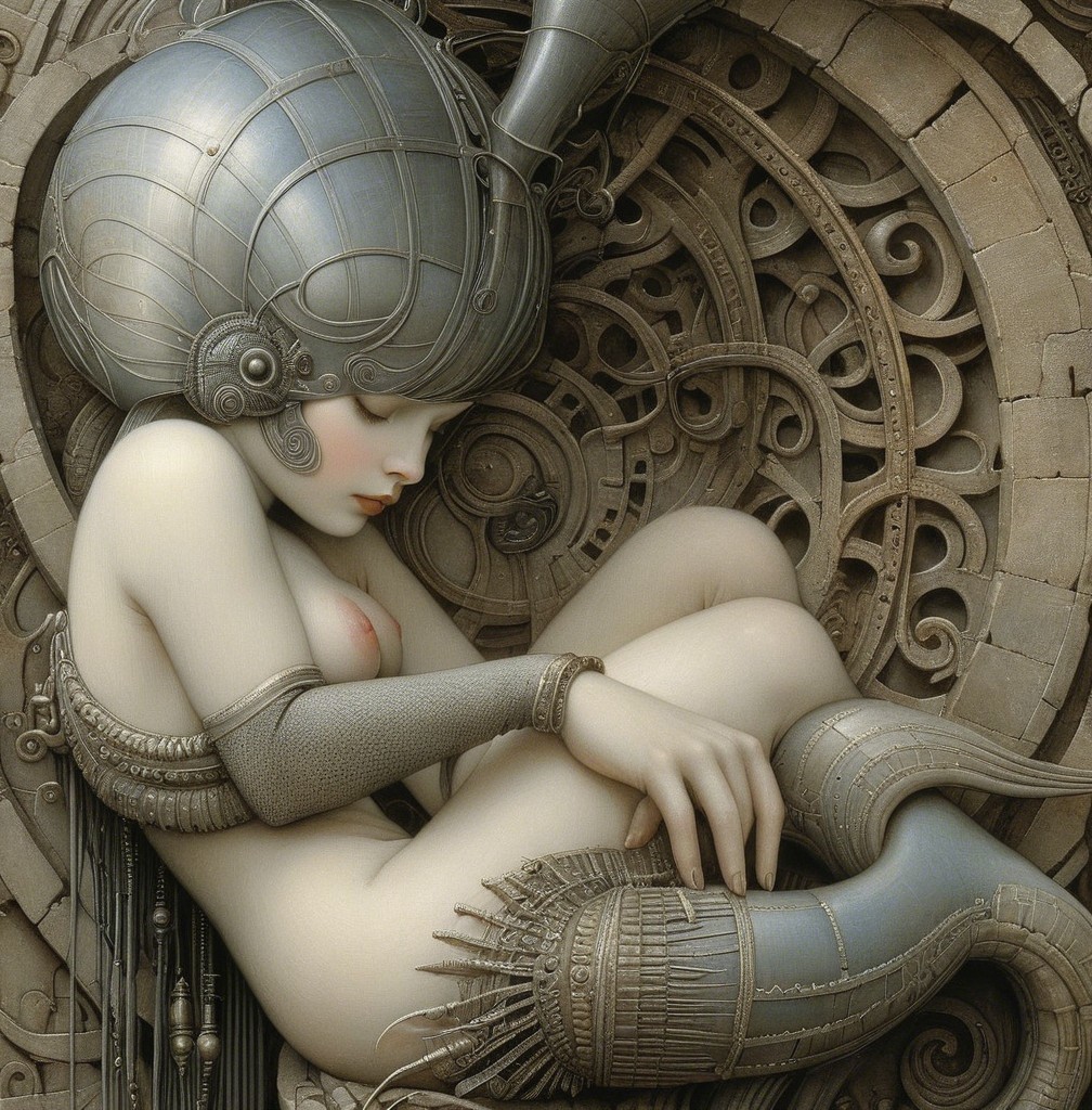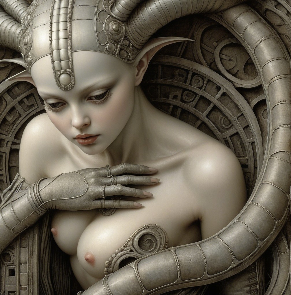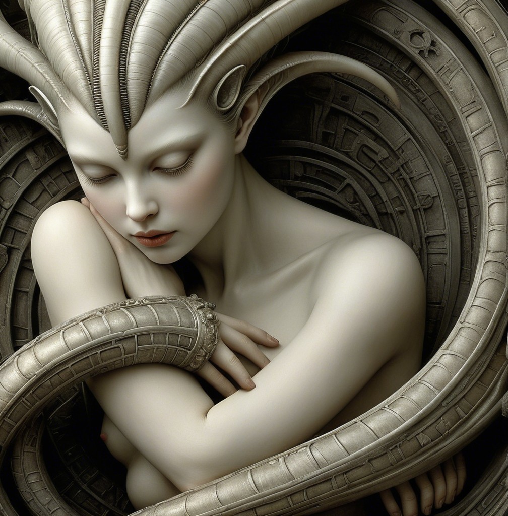 A figure with pale skin and striking features, adorned in elaborate silver jewelry. Their haunting gaze is accentuated by dark lips against a futuristic, metallic background.
