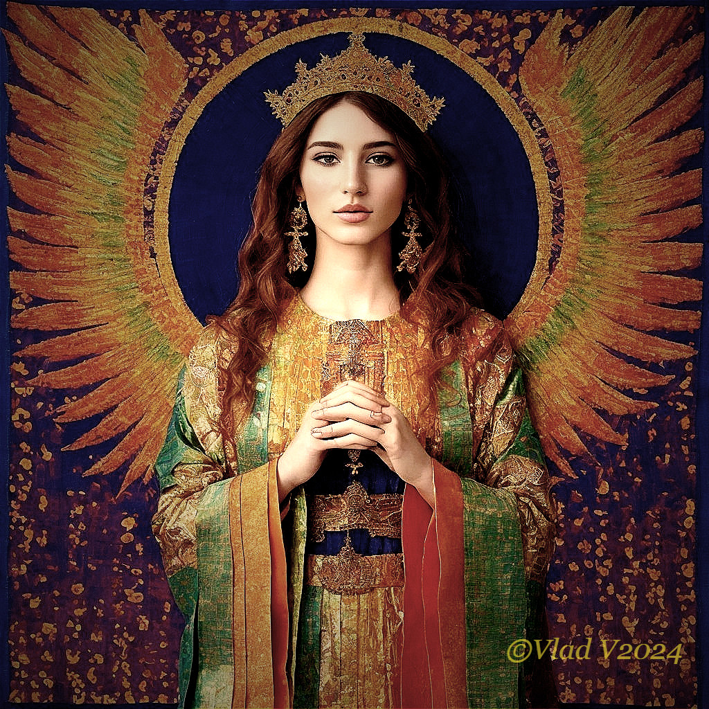 A woman depicted in a saintly manner with a golden halo, ornate attire, and hands clasped in prayer against a rich, textured backdrop.