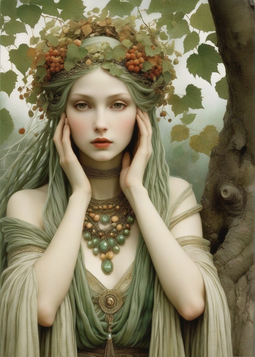 Pale-skinned woman in green gown and leafy crown against tree backdrop