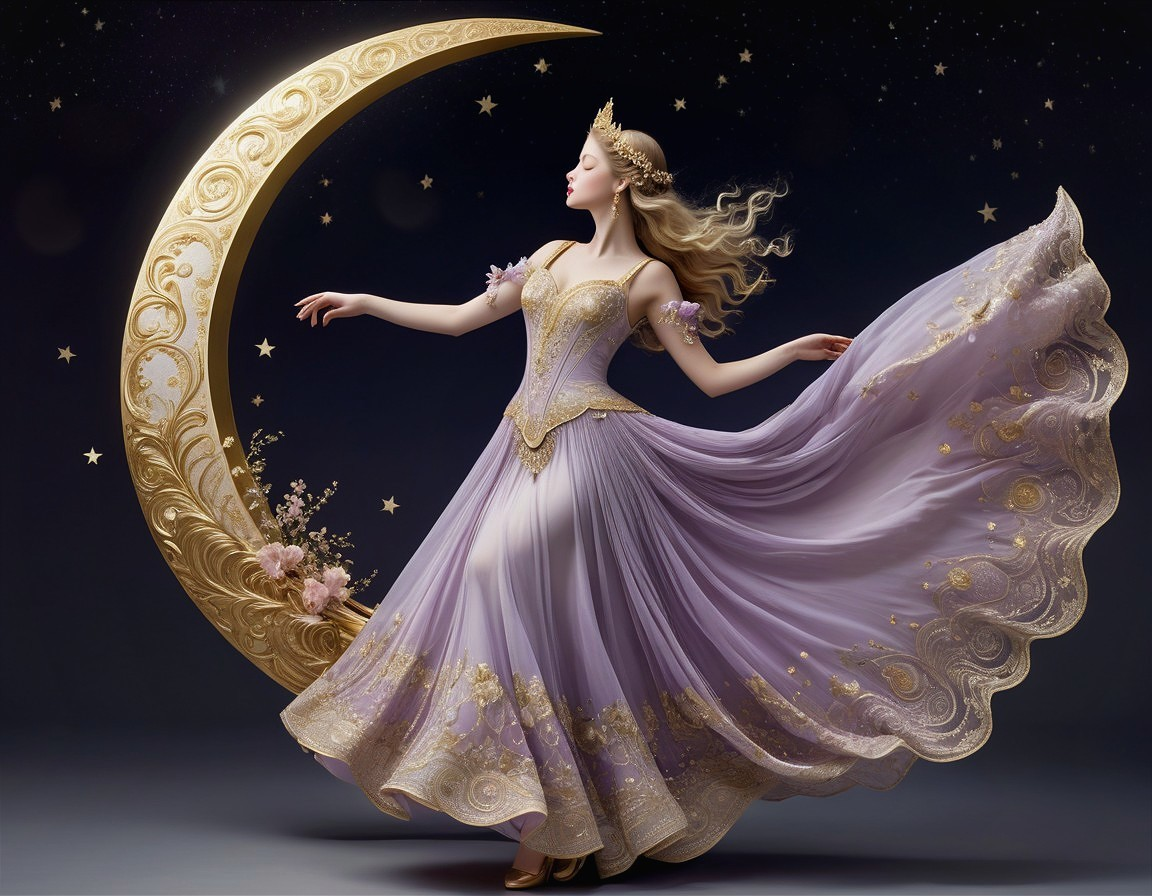 151515; [An image of a surreal, celestial scene featuring a graceful, ethereal female figure dancing within a large, ornate crescent moon. The moon should be adorned with intricate golden filigree patterns, which also decorate the flowing dress and hair of the figure. The dress should be semi-transparent, white with shades of pale lilac, and accented with gold details that mimic the moon's decoration. The figure's hair is golden, wavy, and swept by an unseen cosmic wind, and she should have a soft, serene expression, her face upturned and partially obscured by the brightness of a small moon she cradles in her hand]