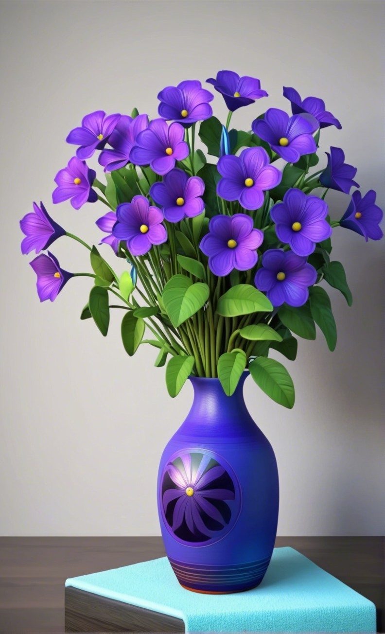 A vibrant bouquet of purple flowers blooms in a decorative blue vase, accented with a colorful floral design. The arrangement is set on a wooden table with a turquoise cloth underneath.