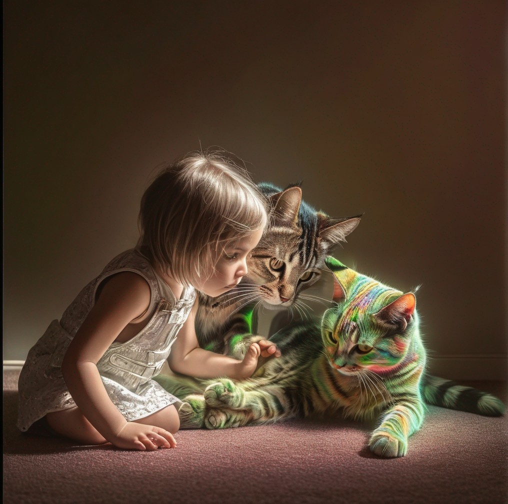 A young child sitting on the floor face to face with a cat. Set in an alien world, futuristic, steampunk cyber alien fantasy
