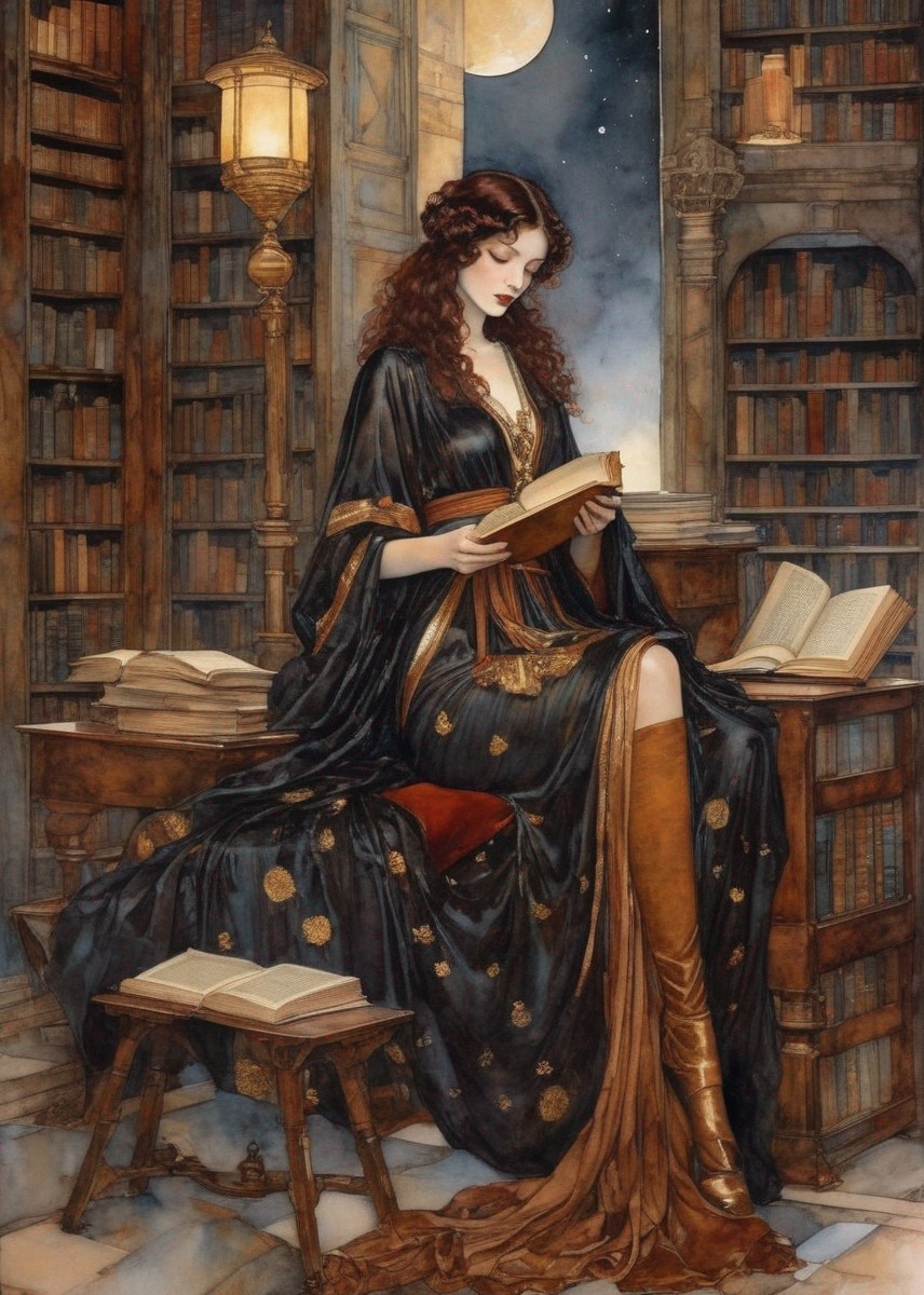 + Prompt:A stunning enchantress, adorned in an exquisite library, engrossed in the examination of ancient manuscripts under the gentle glow of moonlight.