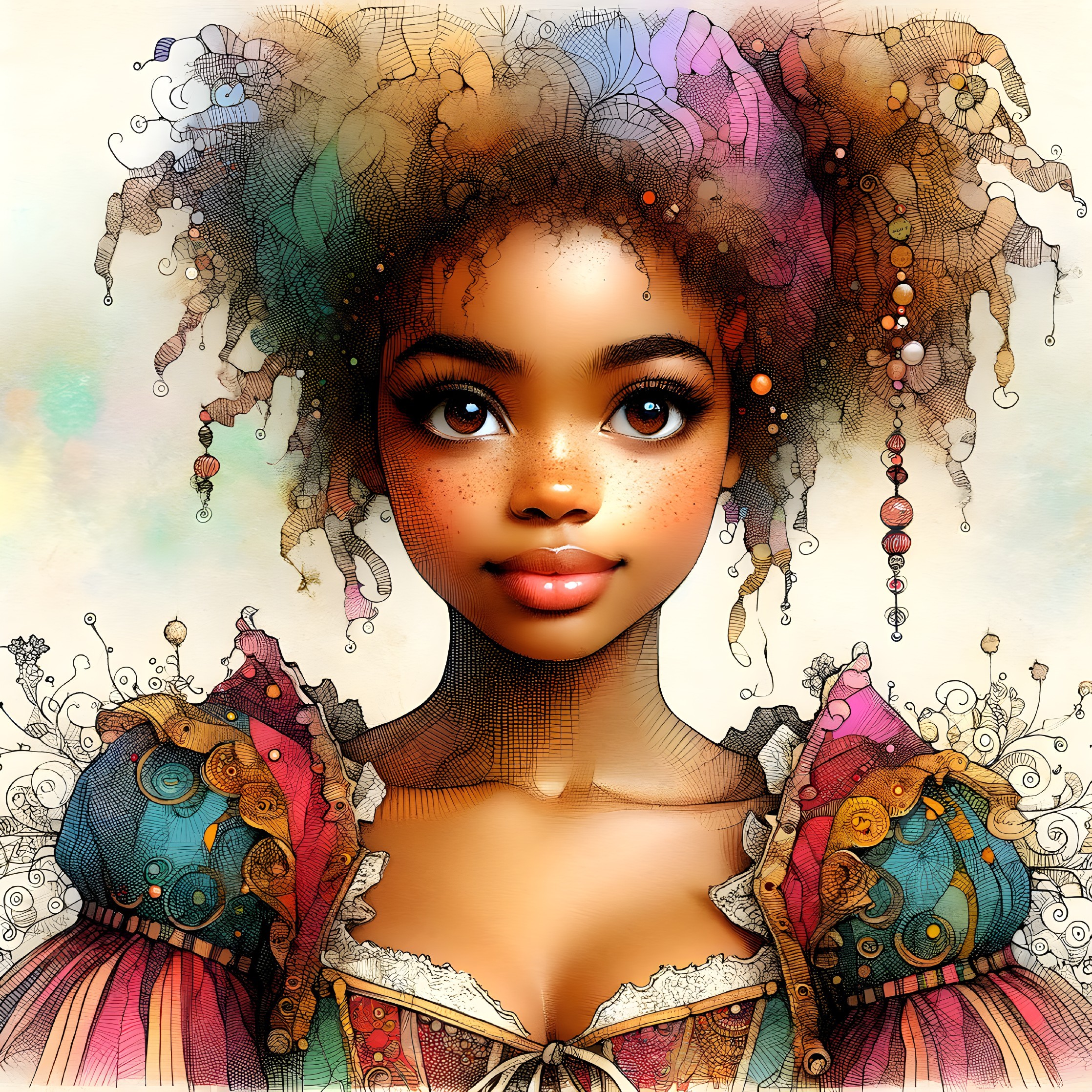 A vibrant digital portrait of a young woman with ornate, colorful hair accessories set against a whimsical background with beads and gears.
