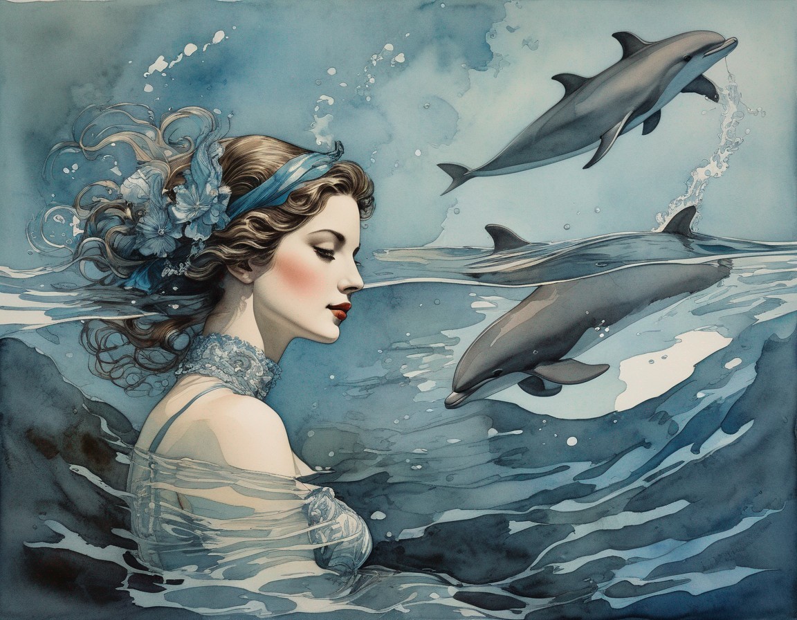 soft watercolor extra water in Art Deco by Annigoni, Egon Schiele, Milo Manara, Botticelli, Catrin Welz-Stein, Jean Metzinger, Klimt, perfect eyes, perfect handsface, highly detailed, complementary colors, hyper detailed. Watercolor and ink splatter, dynamic pose, dark blue background, unreal engine, greg rutkowski, loish, rhads, beeple, makoto shinkai and lois van baarle, ilya kuvshinov, rossdraws, tom bagshaw, alphonse mucha, global illumination, detailed and intricate environment