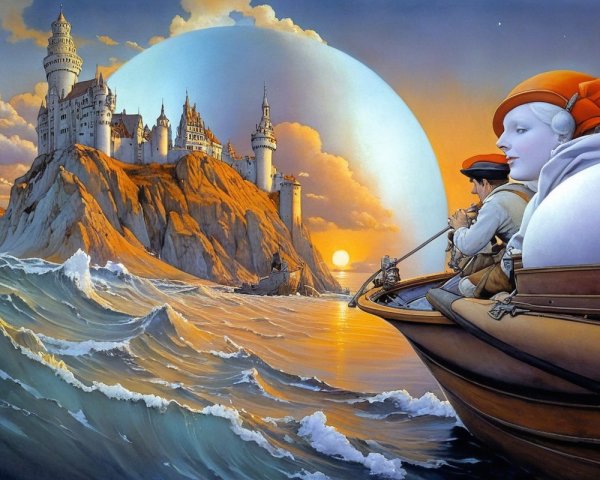 A whimsical gothic mansion stands on an island, illuminated by moonlight. Nearby, a ship sails on calm waters, while figures fish under a starry sky, with a red balloon floating above.