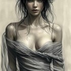 A portrait of a young woman with soft features, wearing a flowing, sheer gown. Her hair is styled in loose waves, and she gazes directly at the viewer with a calm expression.