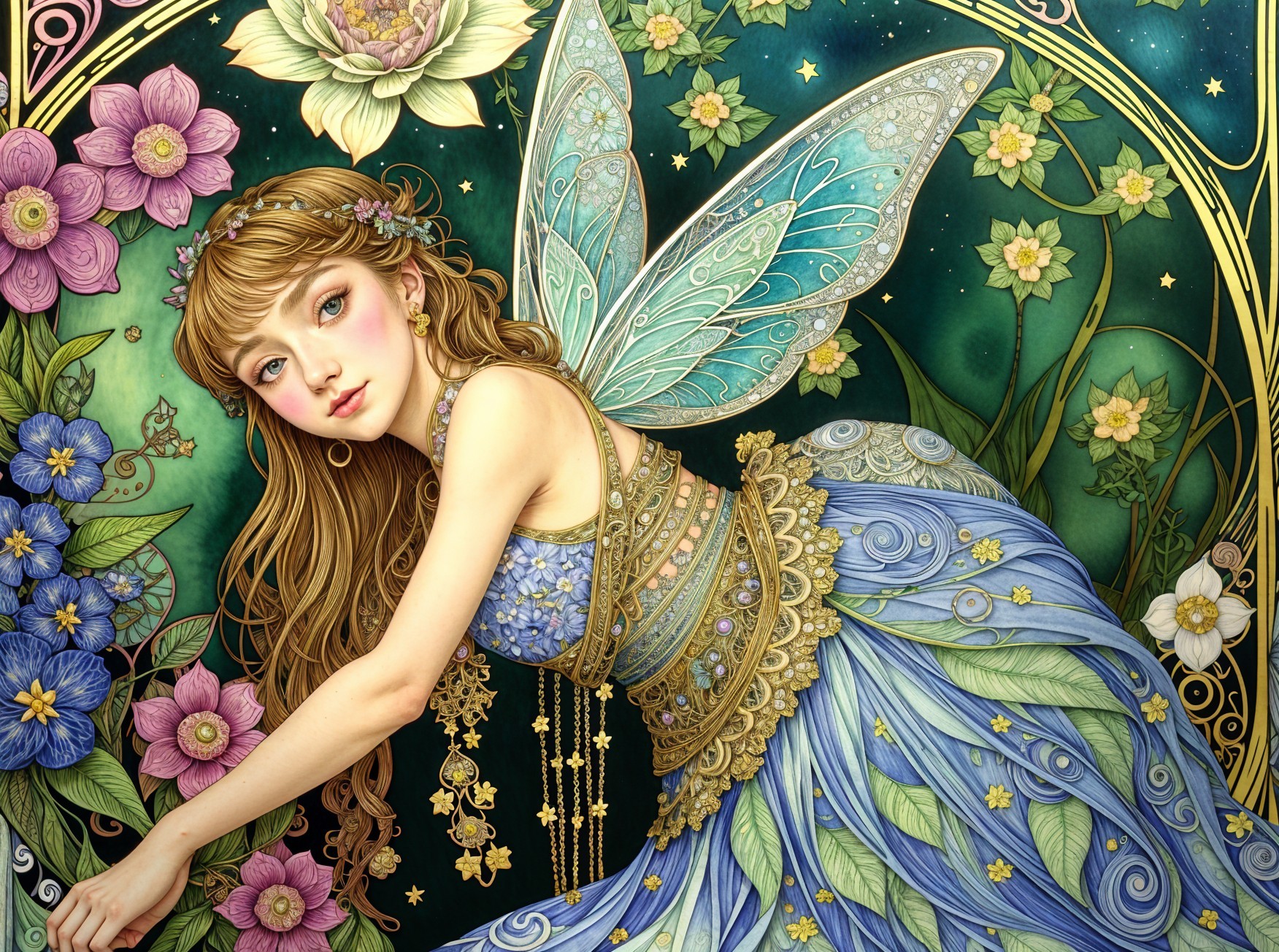 A whimsical fairy with intricate wings leans gracefully against a vibrant background of flowers and celestial elements, adorned in a beautifully detailed blue gown, exuding enchantment and elegance.