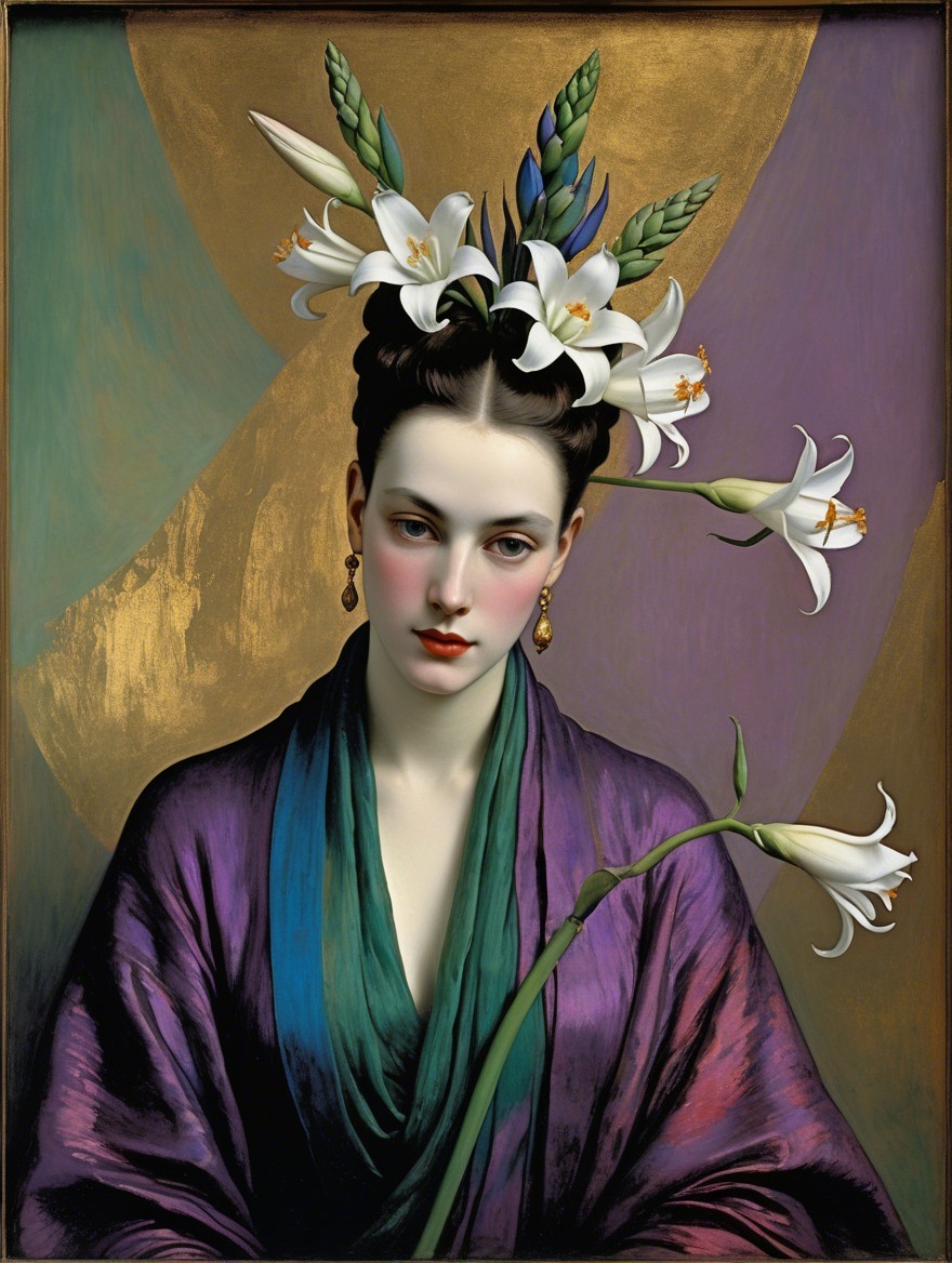 A portrait of a woman adorned with a colorful silk robe and a delicate arrangement of white lilies in her hair, set against a vibrant, golden background, conveying elegance and beauty.