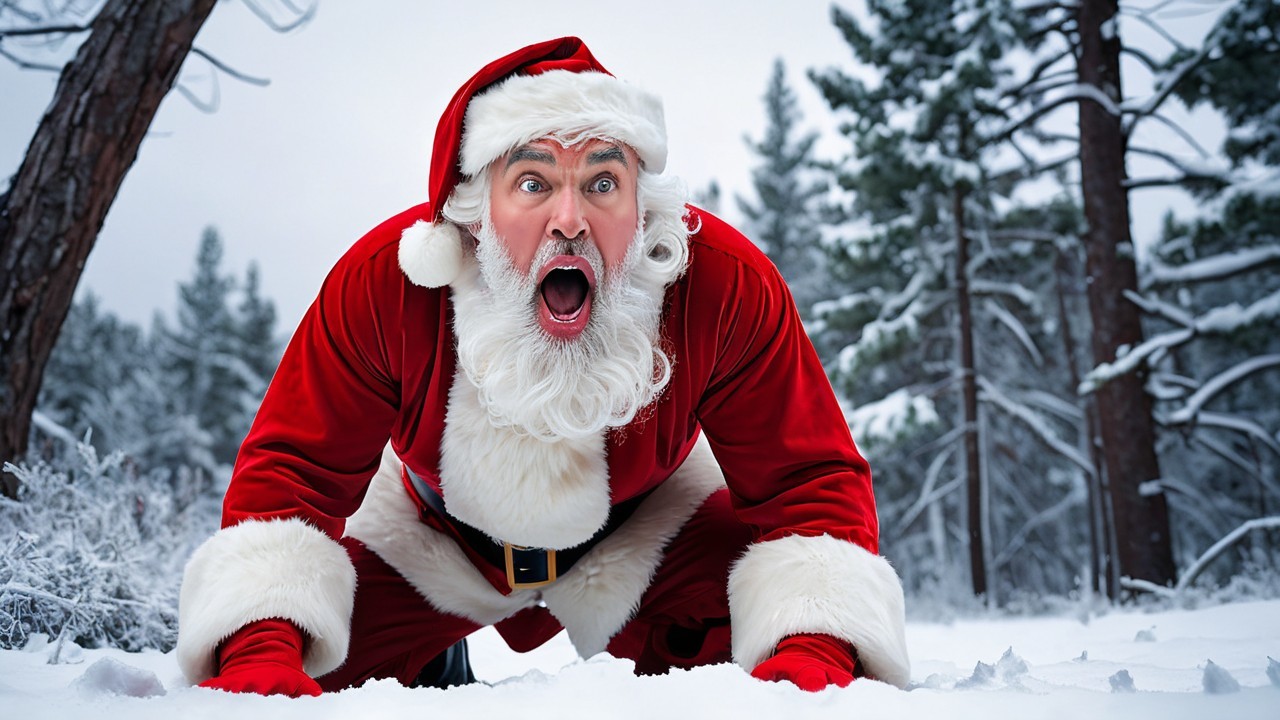 A Santa Claus figure is crawling on the snowy ground, looking surprised or distressed amidst a winter forest scene, with evergreen trees surrounding him. The atmosphere feels both humorous and festive.
