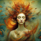 A serene figure with flowing red-orange hair blends into a dreamlike scene. A butterfly swirls around her, creating a vibrant, ethereal atmosphere filled with movement and color.