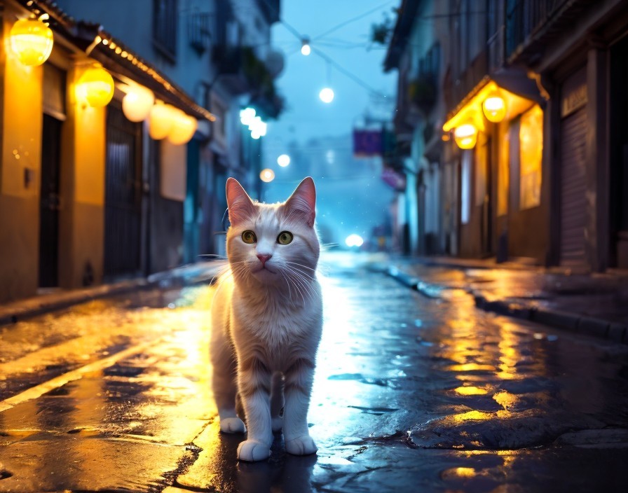 A white cat stands in the center of a rain-soaked street at night, with warm glowing lights lining the path.