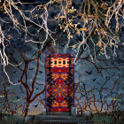 Surreal and mystical, inspired by Remedios Varo. Gray steps leading to a fiery red, beautifully patterned door illuminates its dark surroundings. Dawn, a first glimmer of light is visible in the background. Strange cloud formations in various shades are visible in the background. Bright, gnarled branches hang from above. Bare, dark trees stand on dark ground. Multi-colored branches. In the background, a flock of black birds flies in the distance.
