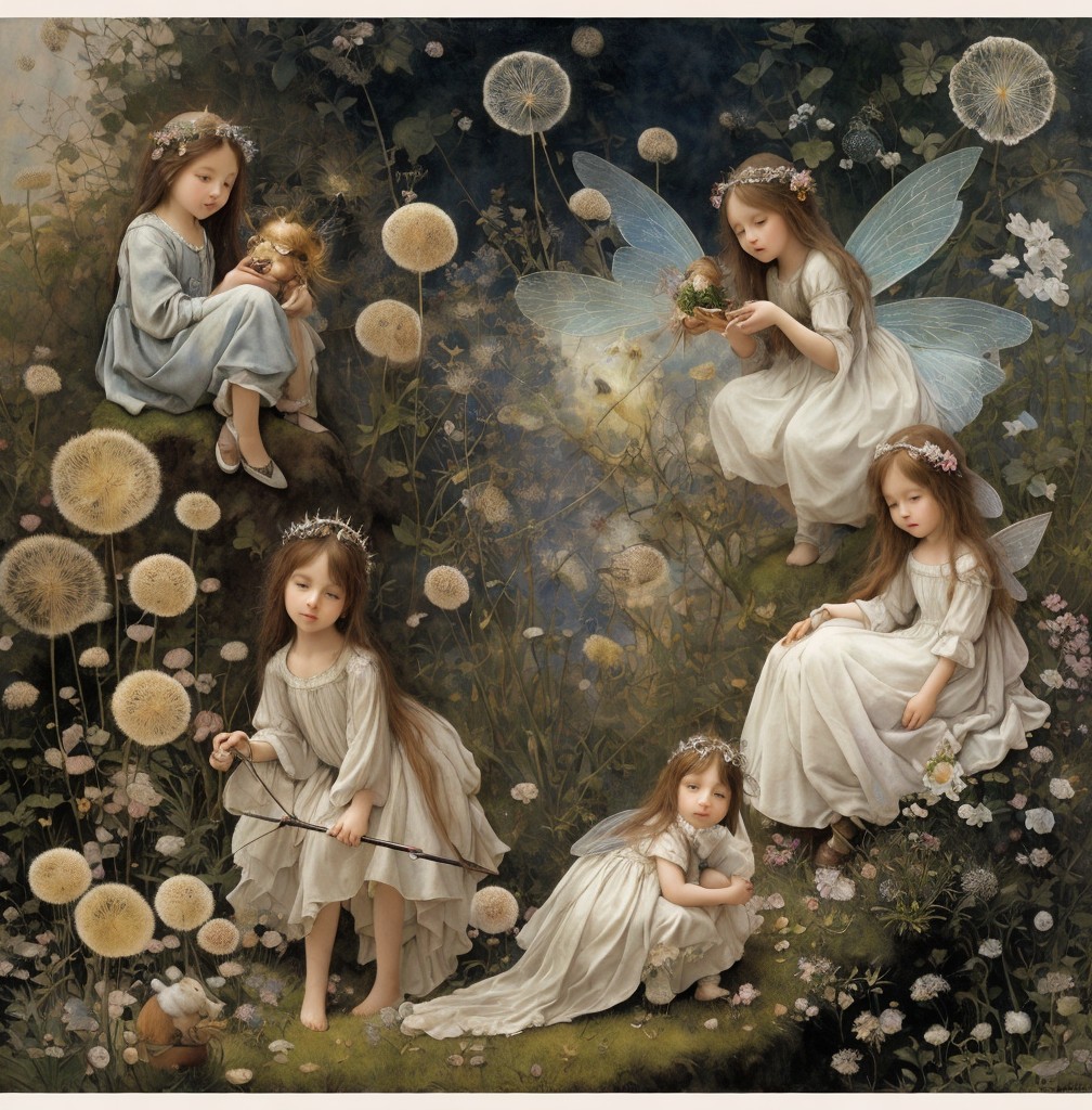 The image depicts four ethereal fairies in serene poses, surrounded by dandelions. They wear delicate dresses and floral crowns, set against a mystical, softly lit backdrop of nature.