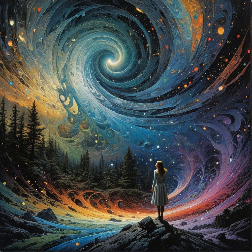 A silhouette of a girl in a white dress stands on a rocky outcrop, gazing at a swirling, vibrant cosmos filled with stars and swirling colors, framed by dark trees beneath a starry sky.