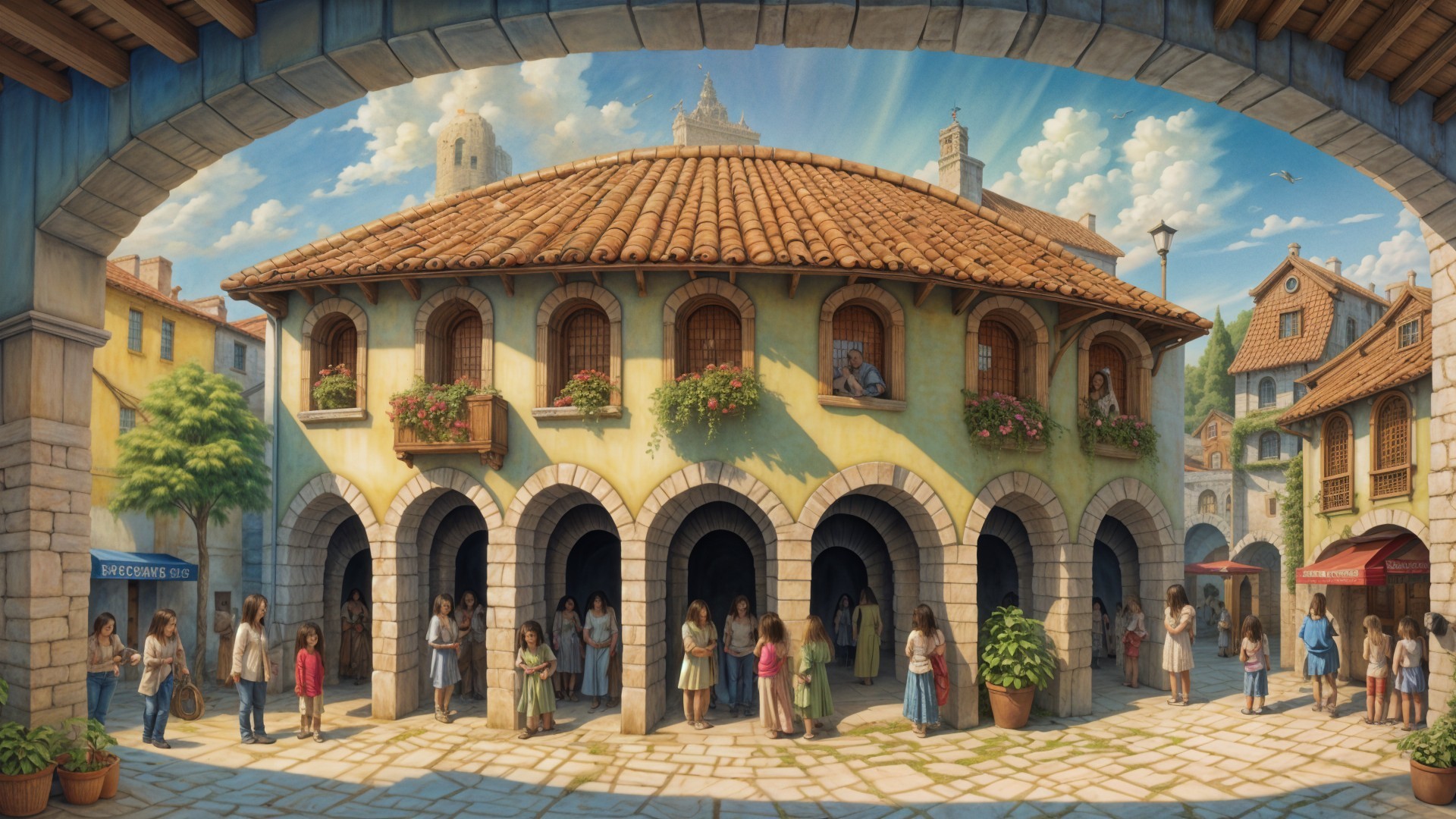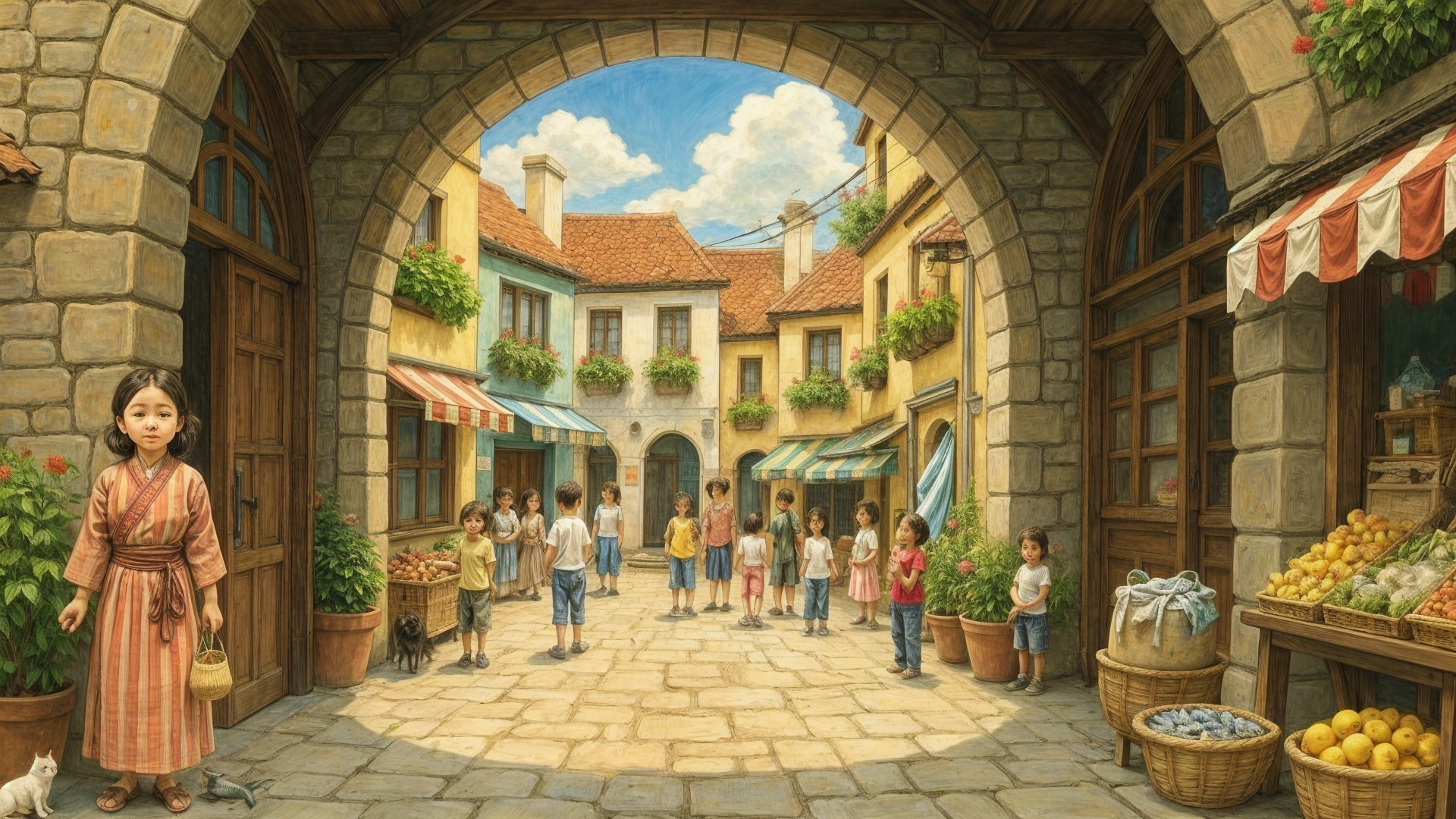 In a vibrant ancient marketplace, people gather under arched stone structures. Sunlight illuminates the scene, highlighting their discussions amidst colorful buildings and lush greenery.