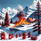 A striking scene features a stylish figure in a flowing red dress and oversized bow, set against a snowy mountain backdrop with vibrant red trees and rustic cabins. Red milk cans line the foreground.