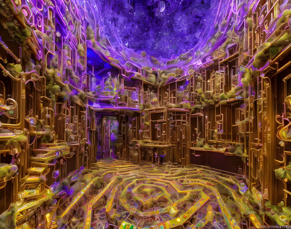 Prompt: stuck on a dmt trip in this complicated maze deep down in my soul with extremely irritating personal parts, weird chimeras of myself. exposed to optical illusions and perspective madness, rushed and misled of endless impossible geometry and inconsistent statics. stairs and doors that lead nowhere. angles that were still corridors and suddenly have neither entrance nor exit. paths leading up to the basement.dissolution of direction, orientation and goals. decay of all sense. kafkaesque grotesques in endlessly repetitive loops shrill colorful cacophony..