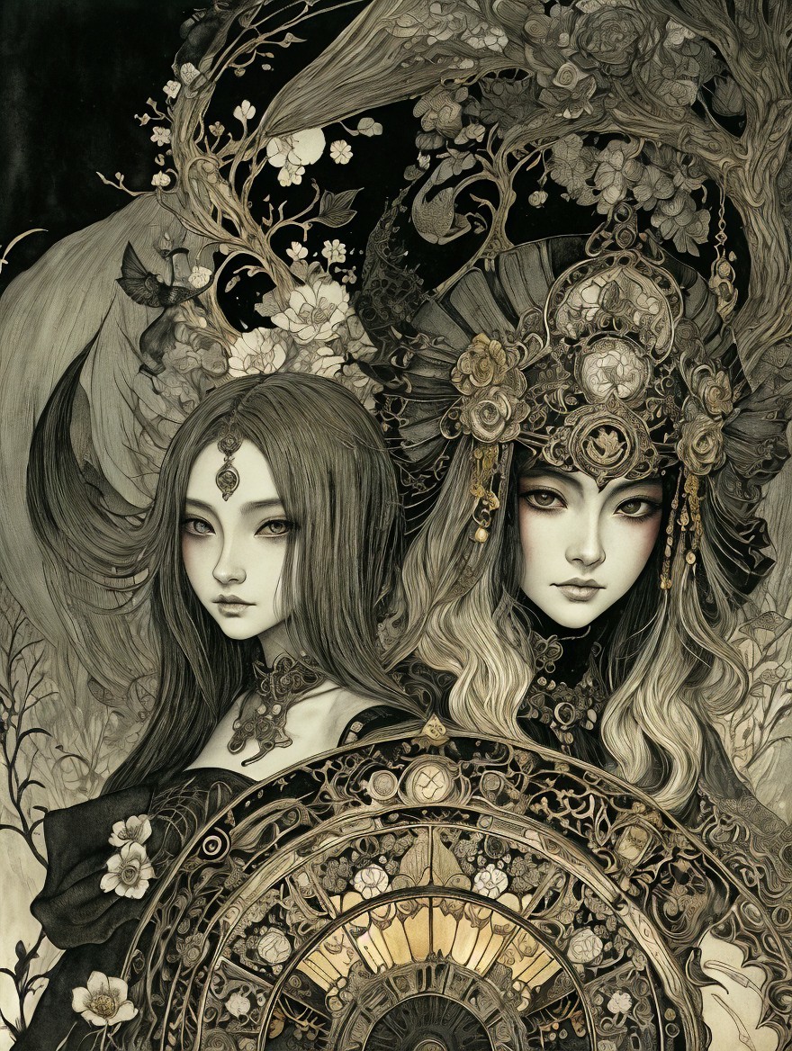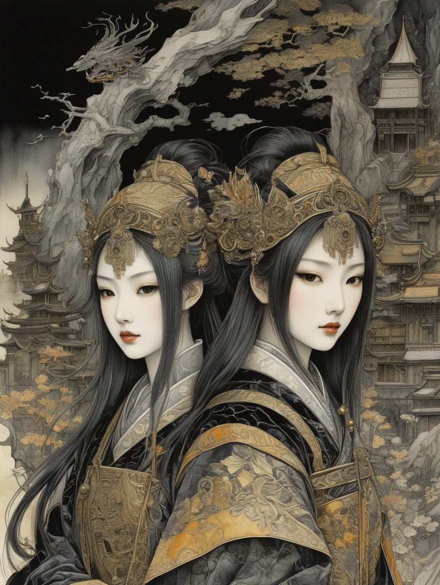 Legend of the Girl of the underworld. Medieval Japanese Artists Sumi-e Style, Velvet Black, Shabby, Dull Gold, Amber Gray, Golden Ratio, Surreal Fantasy, Elegant, High Definition Ultra Fine 3D Line, Zenangle Style, Watercolor Patchwork ,
