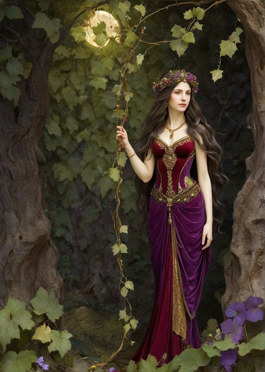 + Prompt:Ampeloi is another female dryad that is mentioned in Greek mythology and lives on grapevines exclusively. 3rd century Persian miniature art, violet, brown green, Ruby red, Velvet Black, Shabby, Dull Gold, Amber Gray, Golden Ratio, Surreal Fantasy, Elegant, High Definition Ultra Fine 3D Line, Zenangle Style, Watercolor Patchwork , Arthur Rackham Style, Paul Kidby, , Jacek yerka, Extremely Detailed, Intricate, Thoughtful, HDR, Fractal, Beautiful, Award Winning, Fantasy Look, Fantasy, Crisp Quality
