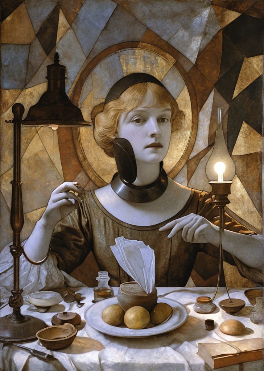 A young woman with an elegant hairstyle sits at a richly adorned table, surrounded by delicate silverware, cookies, and candles, framed by a golden geometric background.