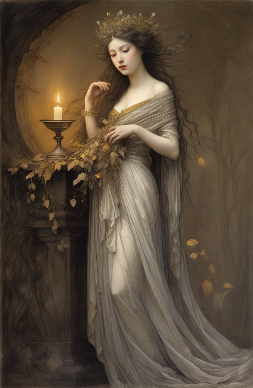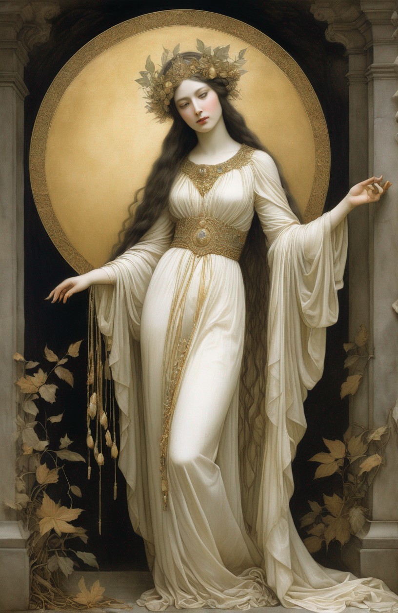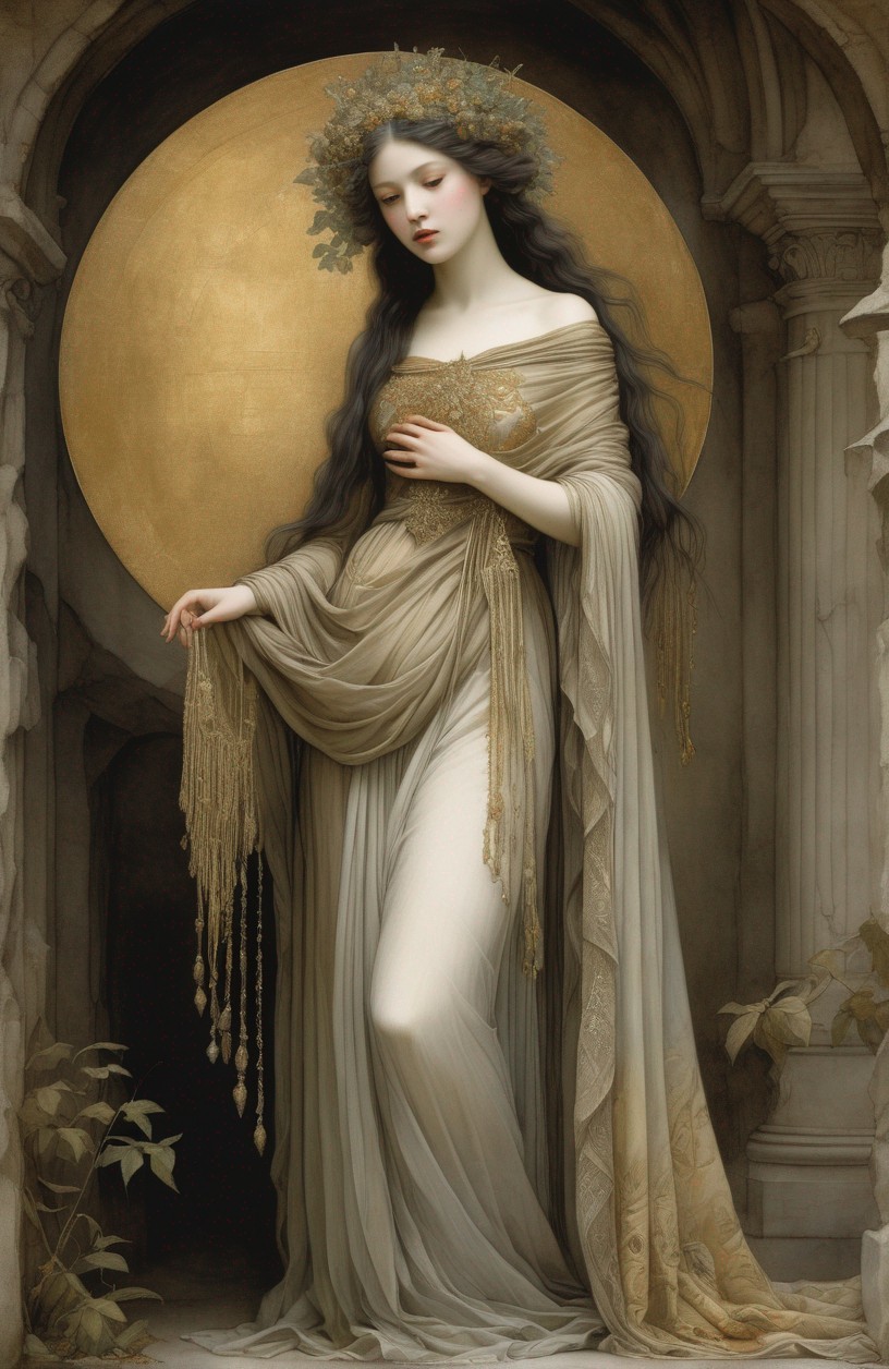 + Prompt:Chrysopeleia is a hamadryad nymph and wife of the king of Arkadia, and it means 'golden dove Dryad priestess in flowing shawls, colored ink drawing, watercolor artwork on old withered paper, vintage, by Caravaggio, by Nicoletta Ceccoli, by Kay Nielsen