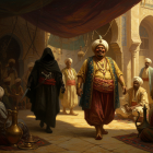 In a vibrant bazaar, a portly man in ornate attire leads the scene, flanked by a shadowy figure. Surrounding merchants and colorful fabrics enhance the exotic atmosphere.