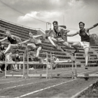 A group of athletes competes in a high-stakes race, leaping off the starting line with determination. The backdrop features a modern stadium and a cloudy skyline, enhancing the dynamic scene.